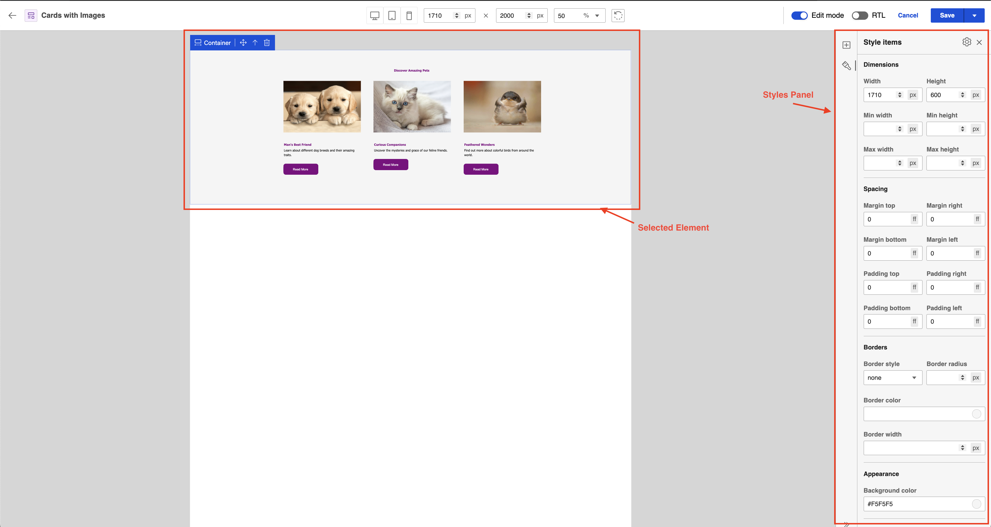 • Width: Adjusts the width of the selected element.