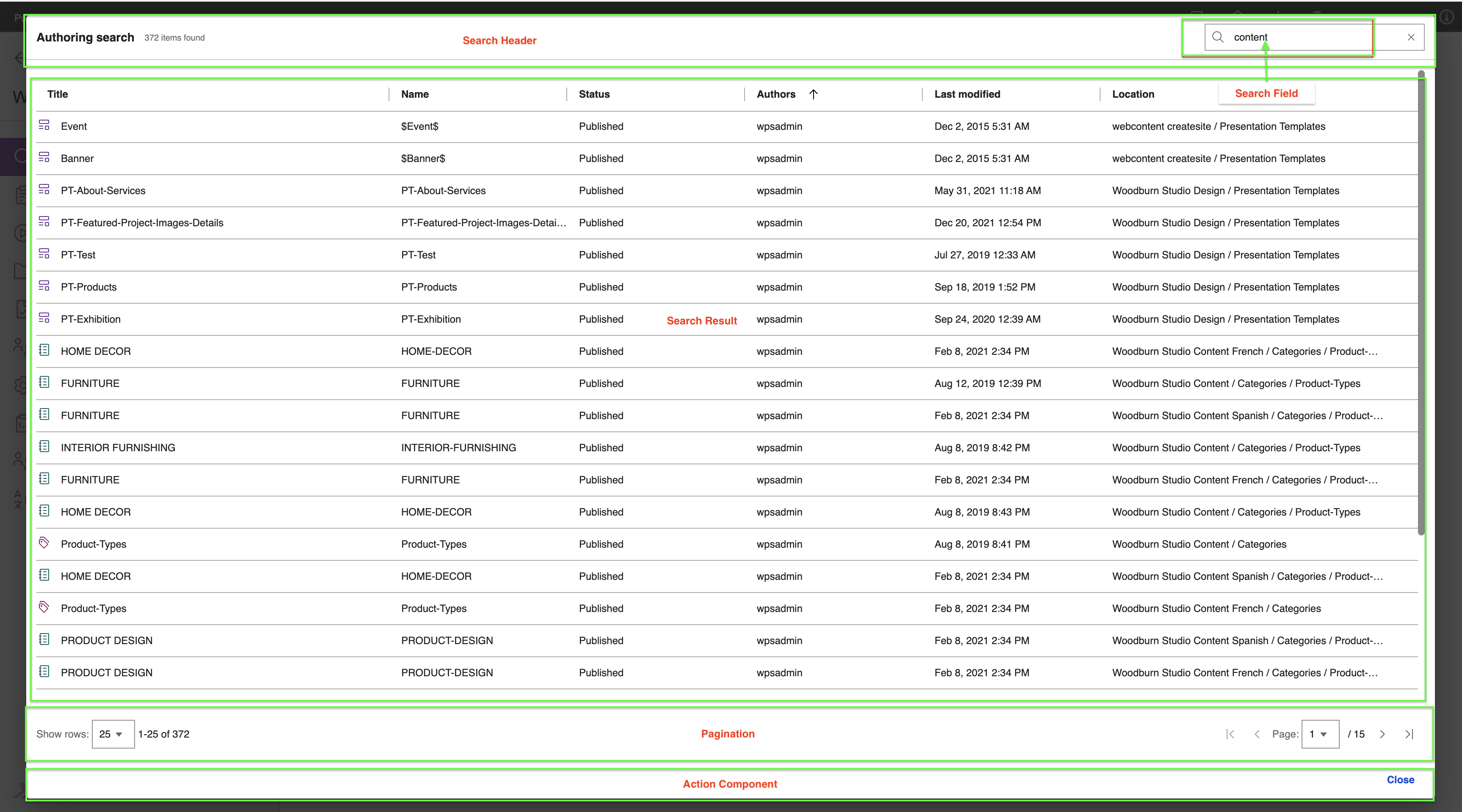 - Search Data Grid - This section displays the search results in a table with columns headers for Title, Name, Status, Authors, Last modified, and Location. Hovering over a column header reveals a sort icon, allowing you to sort the results in ascending or descending order. Each row includes an edit icon to open the item in Edit mode and a three-dot icon to reveal additional options such as Read mode or Preview mode.
