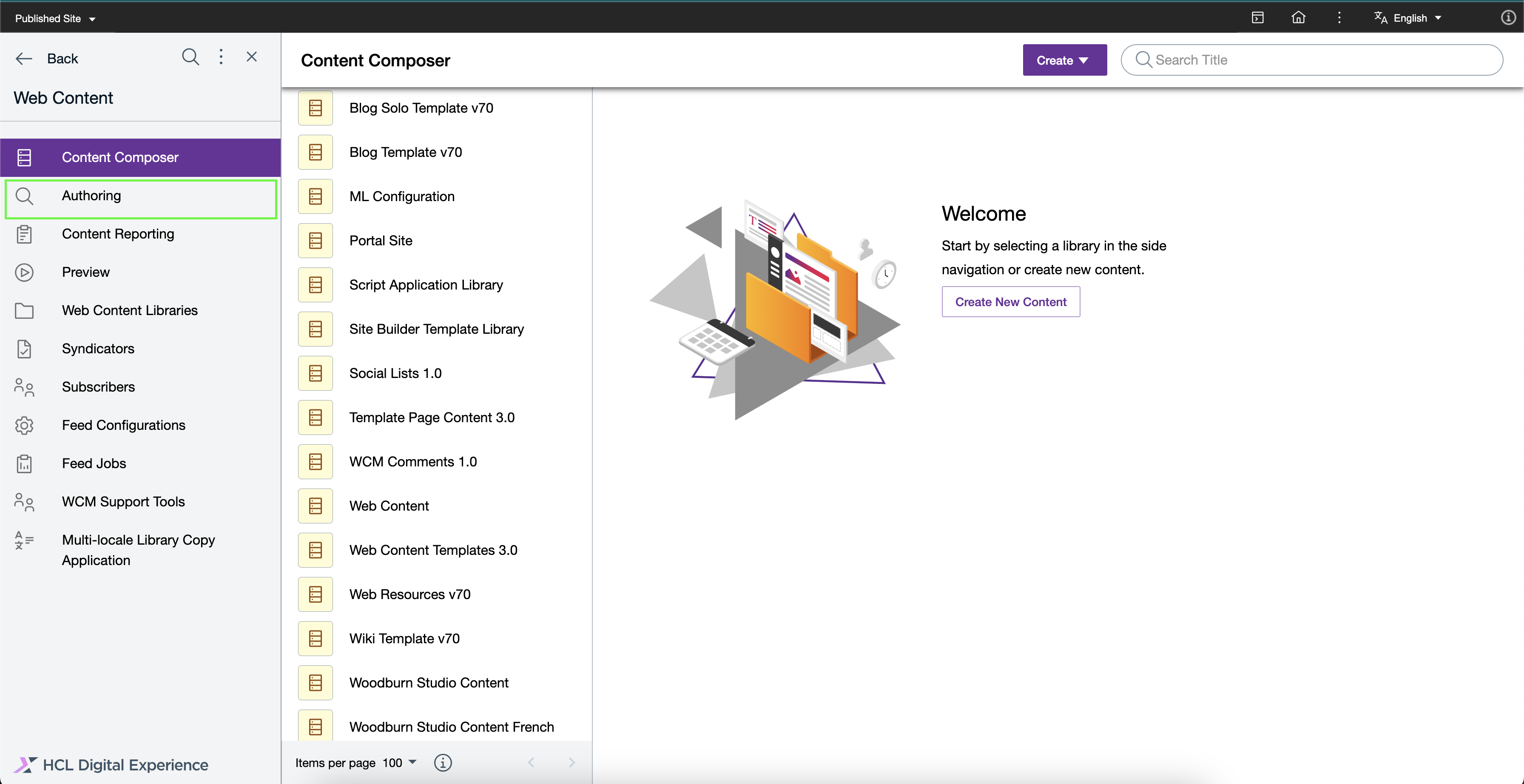 Log in to your HCL DX 9.5 platform then select Web Content from the side navigation panel. Alternatively, you can click the Web Content card from the Practitioner Studio homepage.