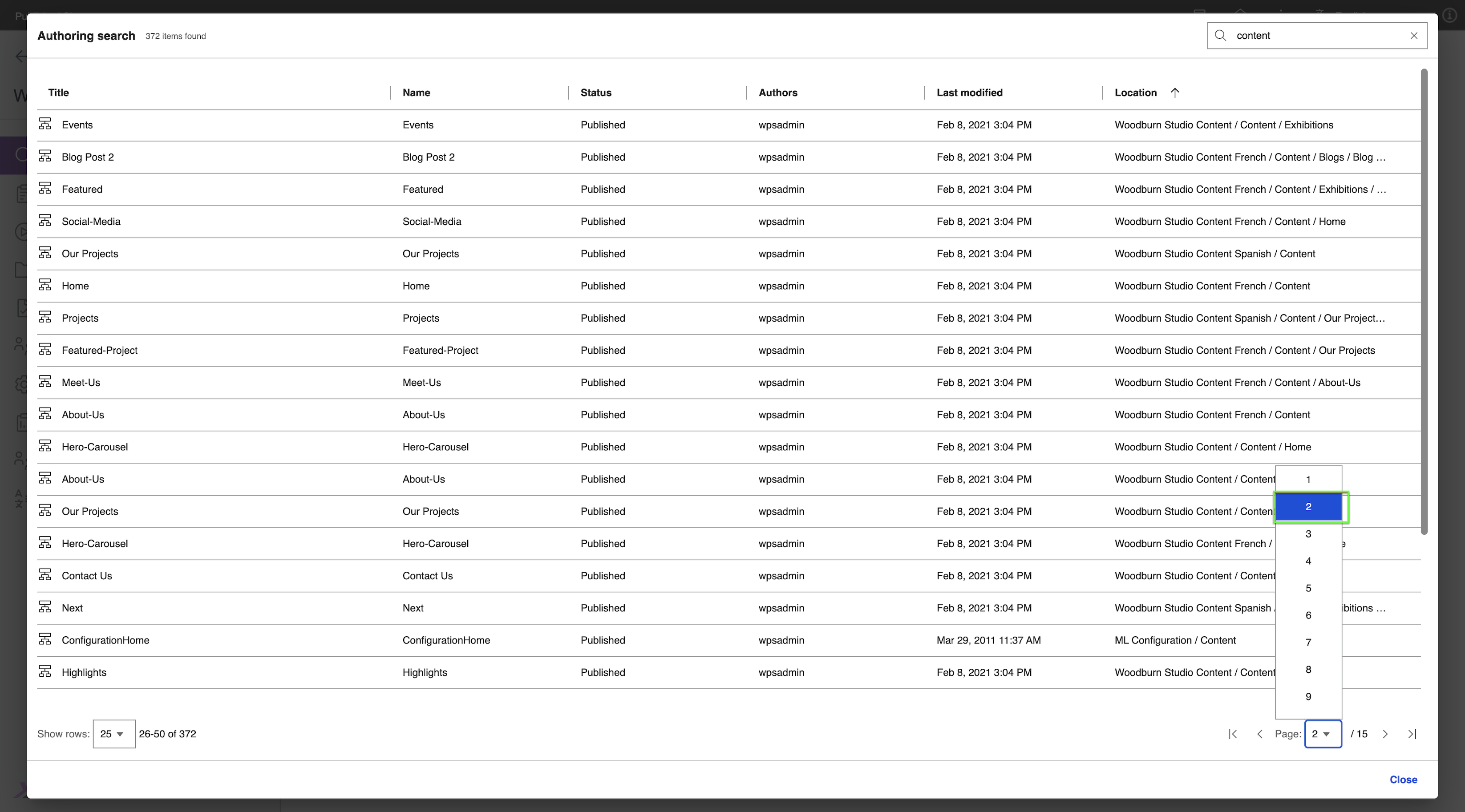 View the search results generated. You can see the total number of search results in the upper-left corner of the dialog. In the following example, the term "content" generated 372 search results. Below the table of results, you can also see more detailed pagination information.