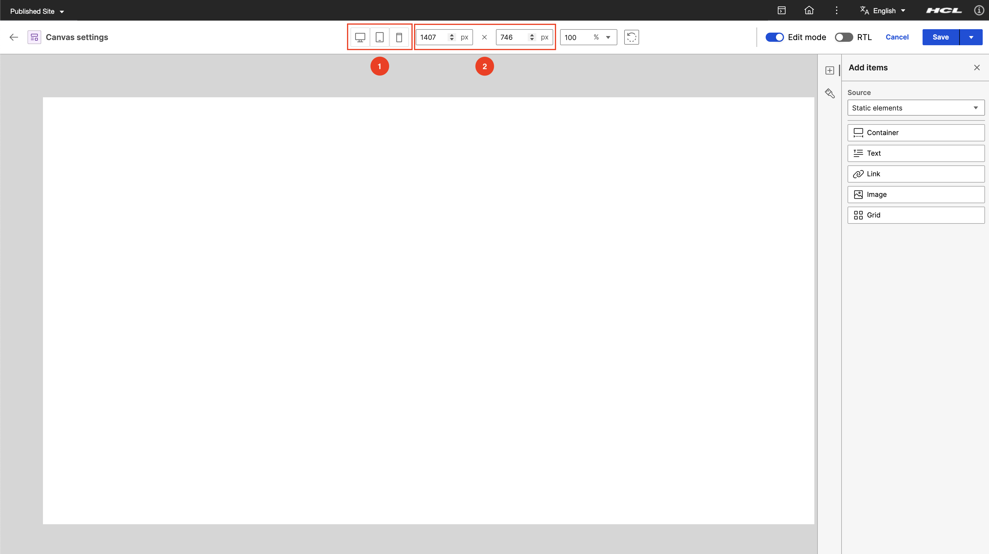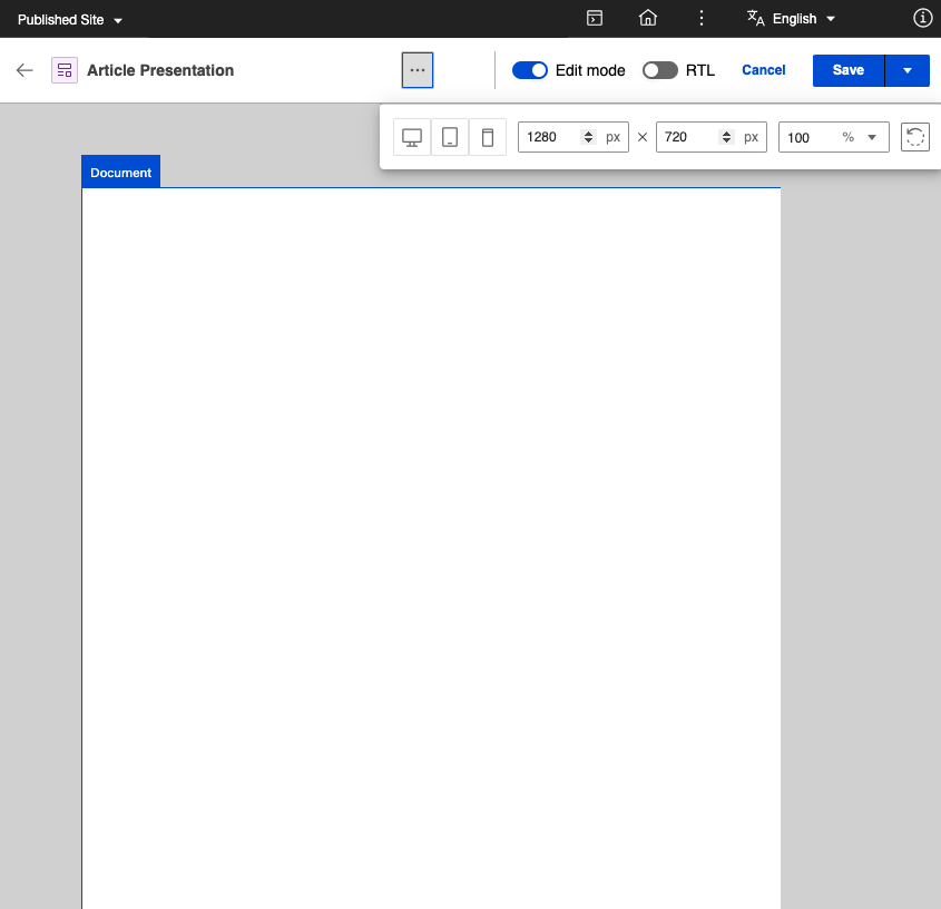 The canvas dimensions settings in Presentation Designer can be used to set the width and height of the canvas to adapt to specified size requirements. You can also use the dimensions settings to select from predefined sizes such as Desktop, Tablet, and Mobile.