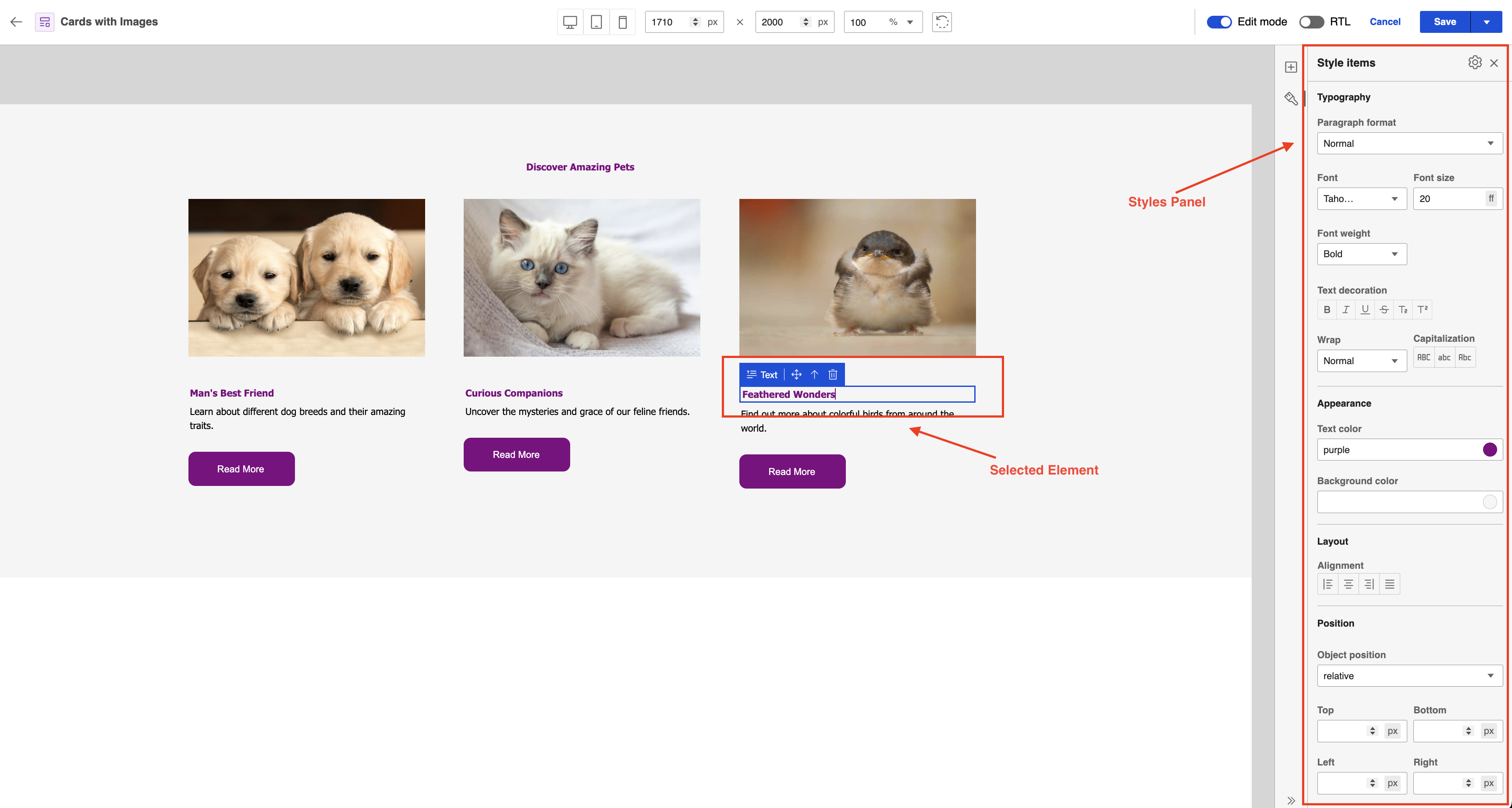 Styling options allow users to make the elements on the canvas presentable. Styles enable an interactive design experience that lets users see their style changes reflected on the canvas in real-time. This topic outlines the different styling options you can do in the Style panel of Presentation Designer.