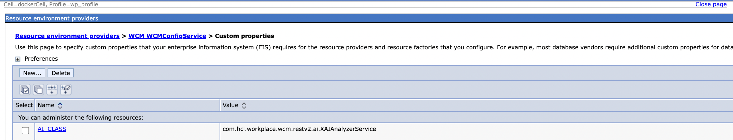AI_CLASSconfiguration property is added in WCM Config Service by going to Custom Properties: click Resource > Resource Environment > Resource Environment Providers > WCM_WCMConfigService > Custom Properties. Possible values forAI_CLASSare:com.hcl.workplace.wcm.restv2.ai.ChatGPTAnalyzerService(ifContentAIProvidervalue is set asOPEN_AI)- Value set in parameter