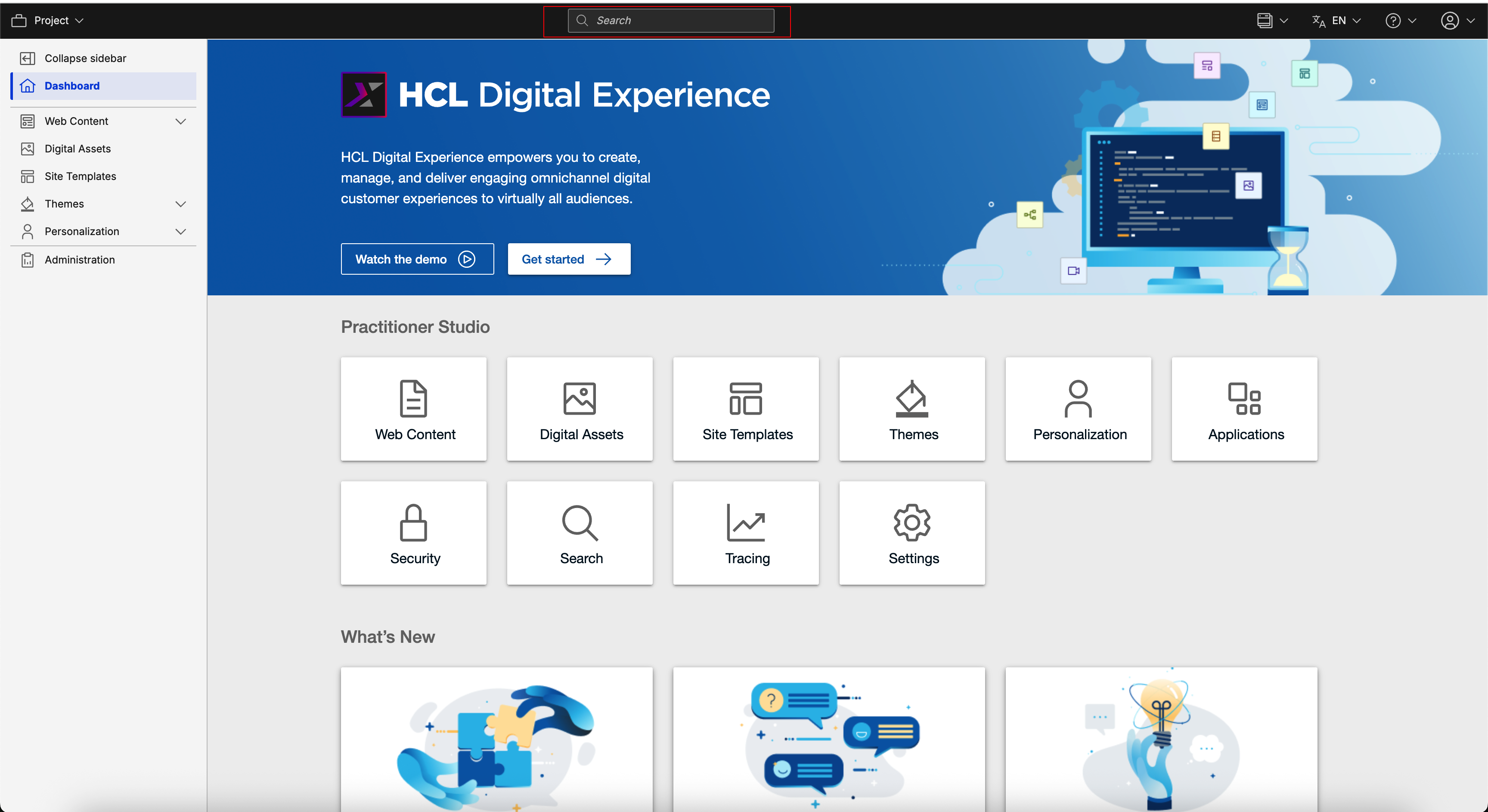 To access Search V2 from Practitioner Studio, log in to your HCL Digital Experience 9.5 platform, and perform a search from the Practitioner Studio homepage by entering your query and pressing Enter.