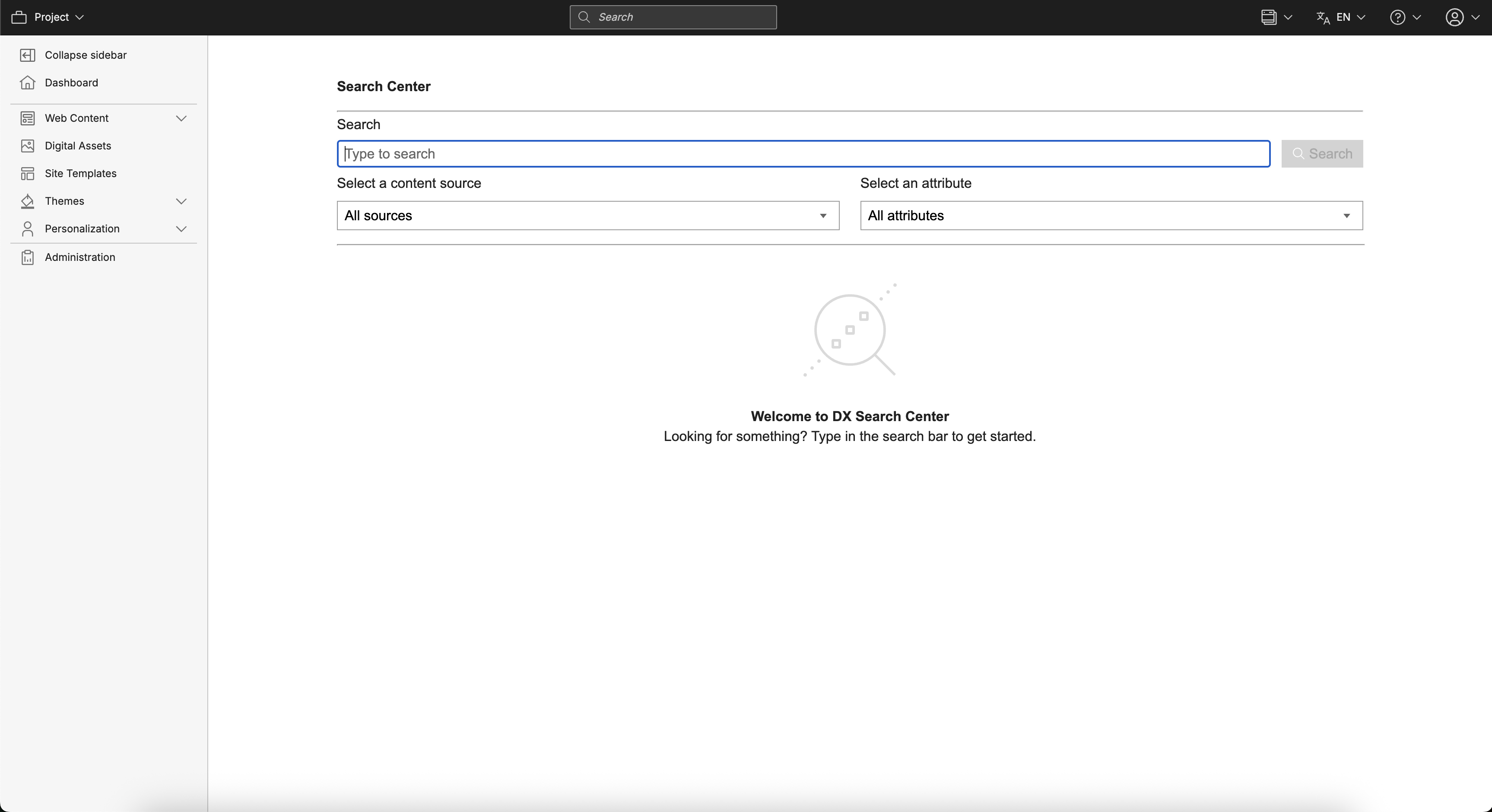 - Search Input - This section displays the fields the user can interact with to modify the search parameters before clicking Search. There are three fields: the search field, the content source dropdown, and the search attribute dropdown.