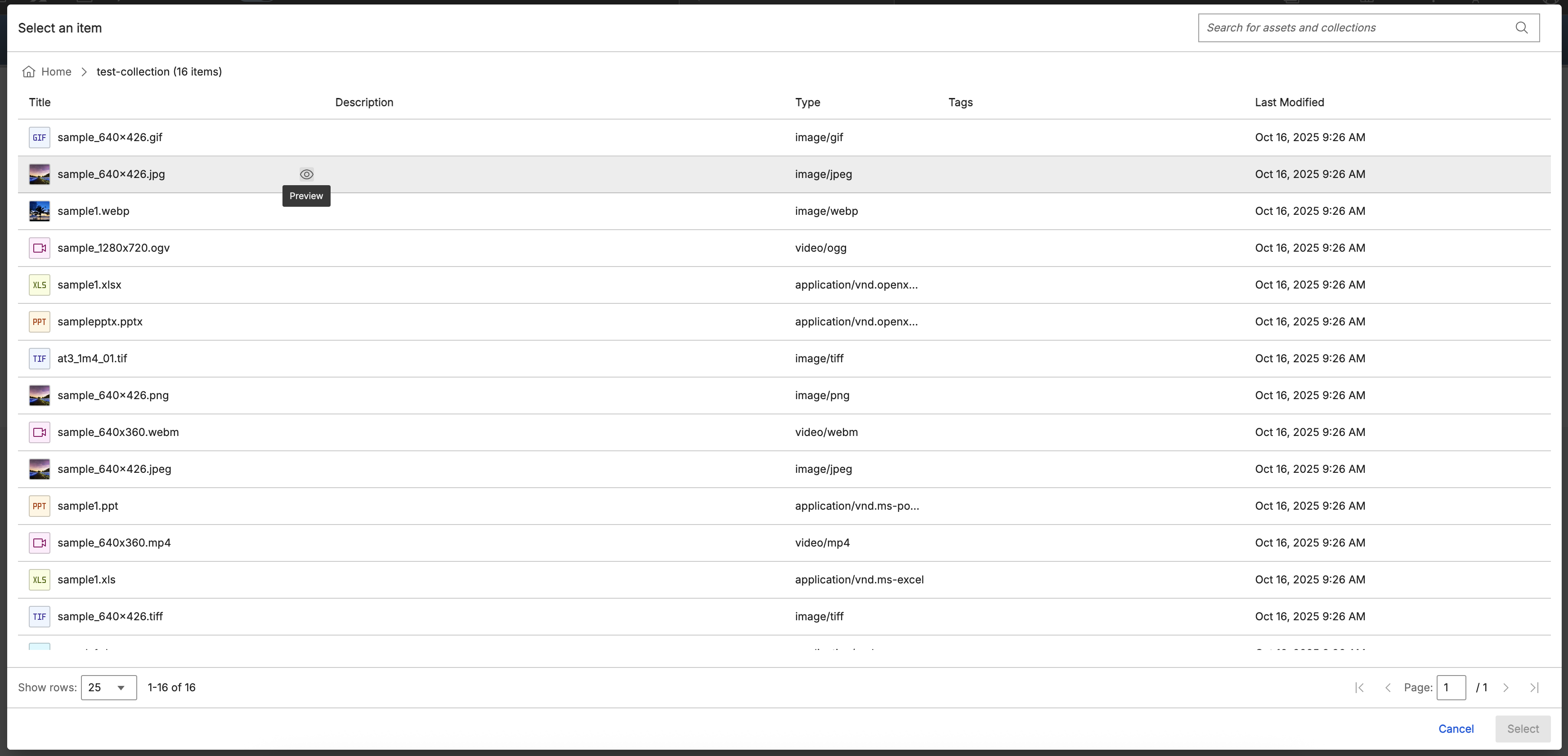 selectedRenditioninside the_sourceproperty. For more information, refer to Picker Events. - Selecting an item from Preview triggers the