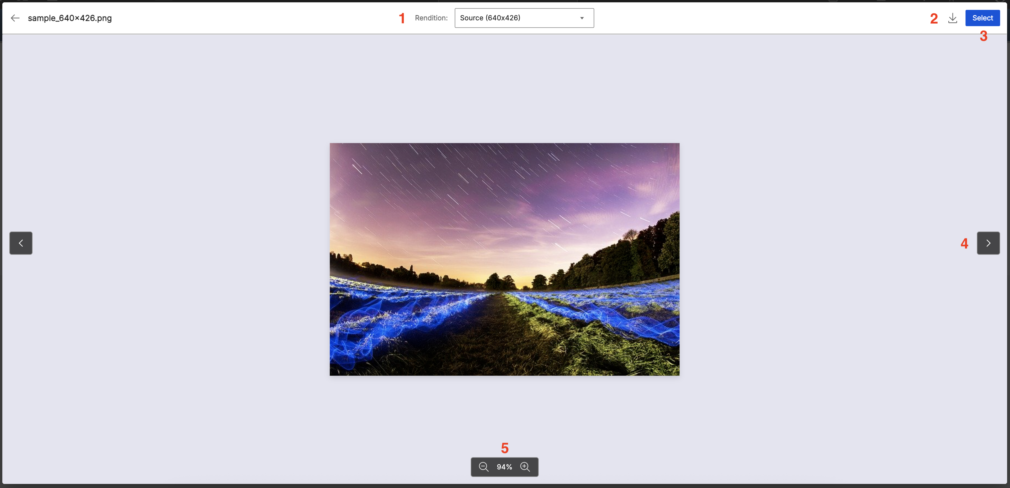 To choose the rendition of the image you want to view, click the dropdown and select the specific rendition. For more information on renditions, refer to Renditions.