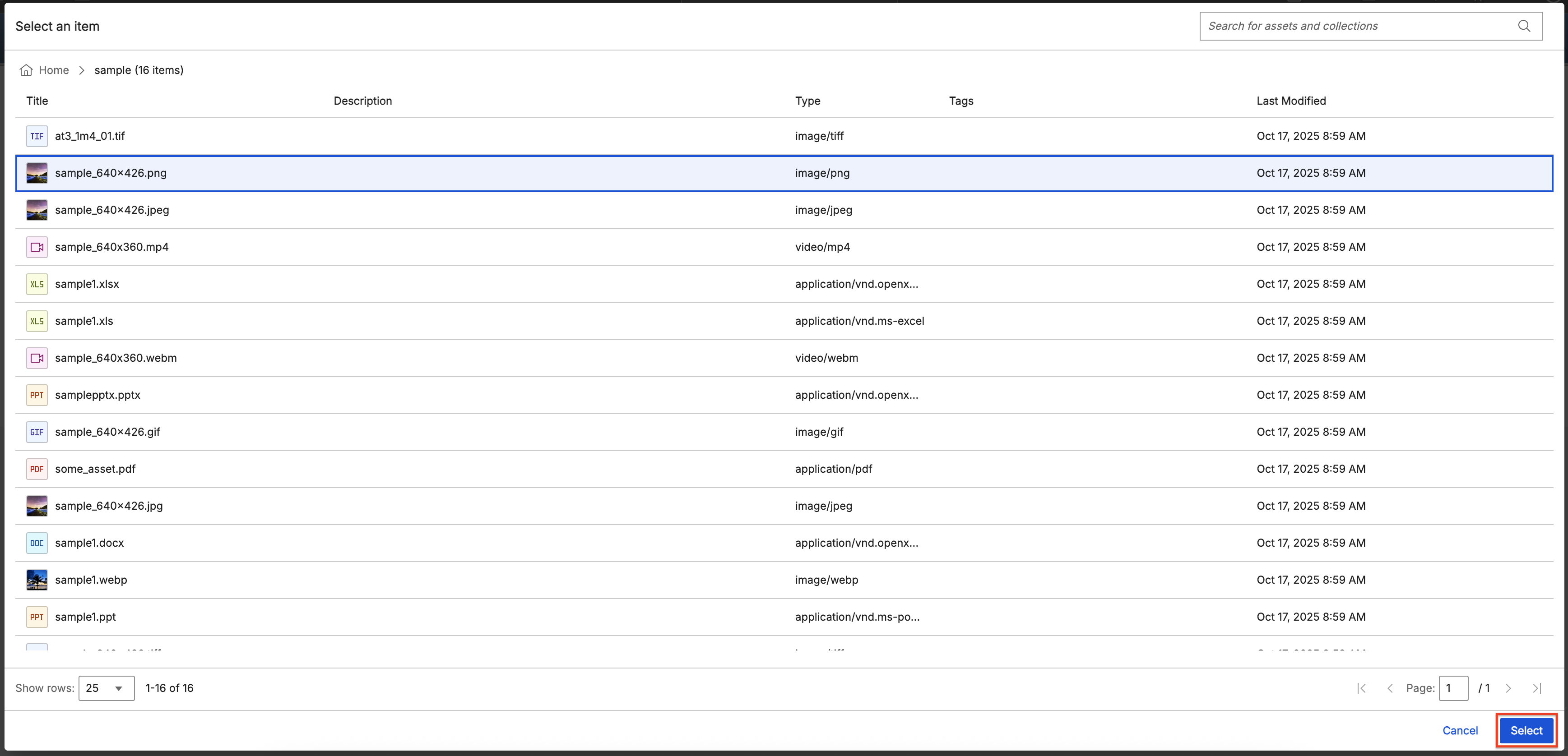 Clicking on an item row enables the Select button on the lower right corner of the screen. This button allows you to select a particular item. Any items from the content source can be selected.