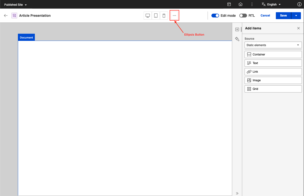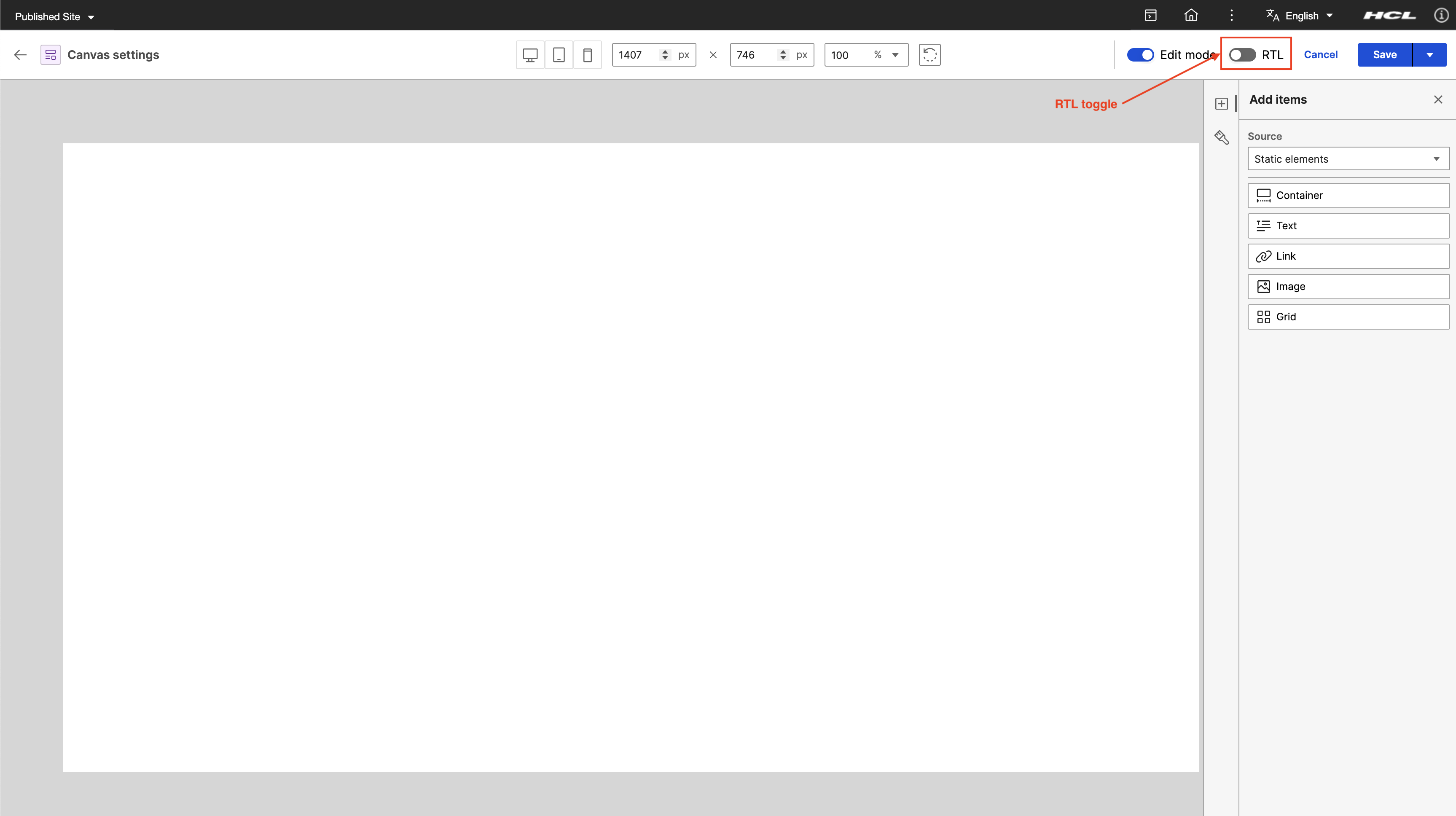 You can switch the canvas orientation from left-to-right (LTR) to right-to-left (RTL), and vice versa using the RTL toggle in Presentation Designer.