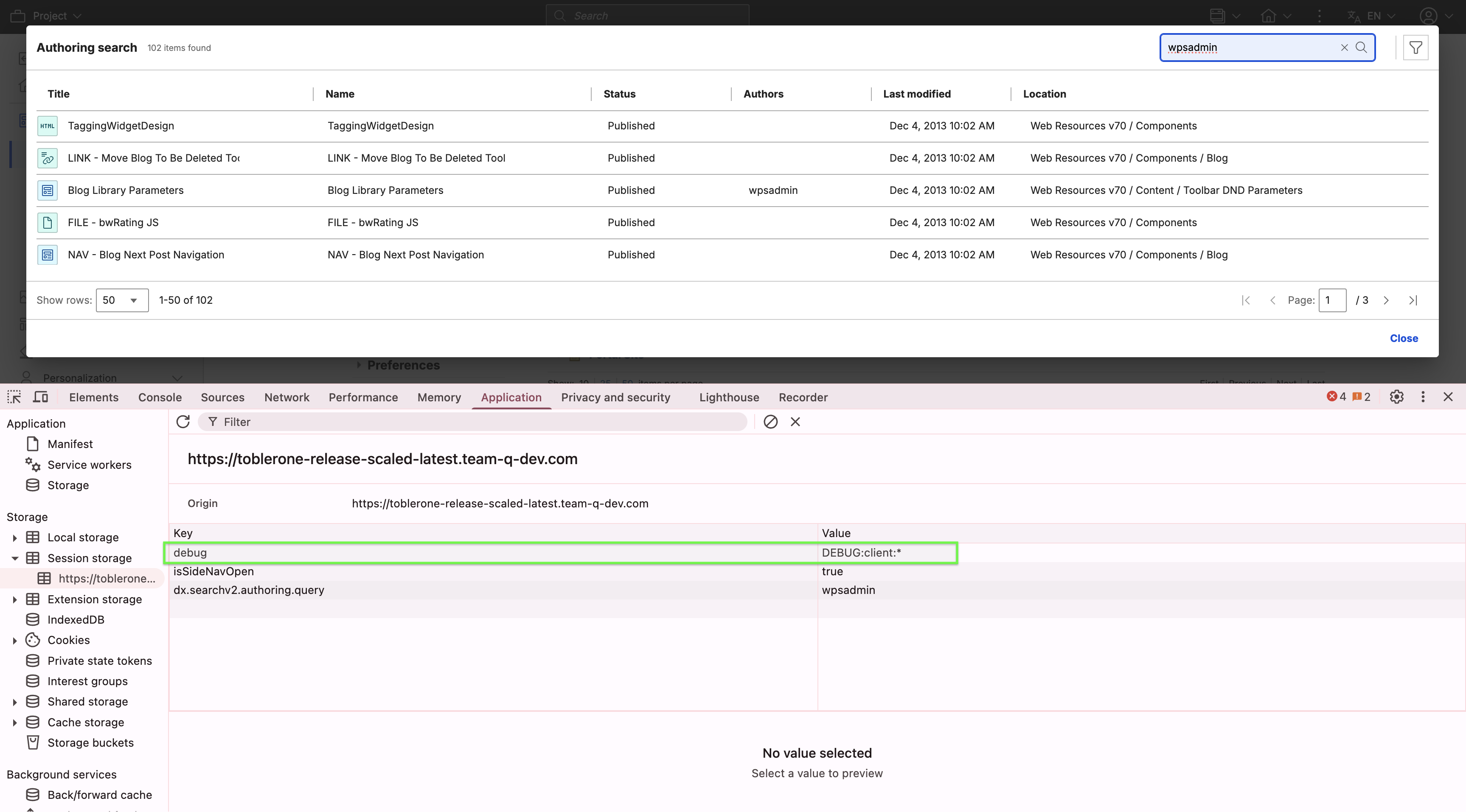 Type of logging Key Value Full logging debugDEBUG:client:Logging all search V2 components only debugDEBUG:client:ui:Logging all AC web components only* debugDEBUG:client:web-components-lib: