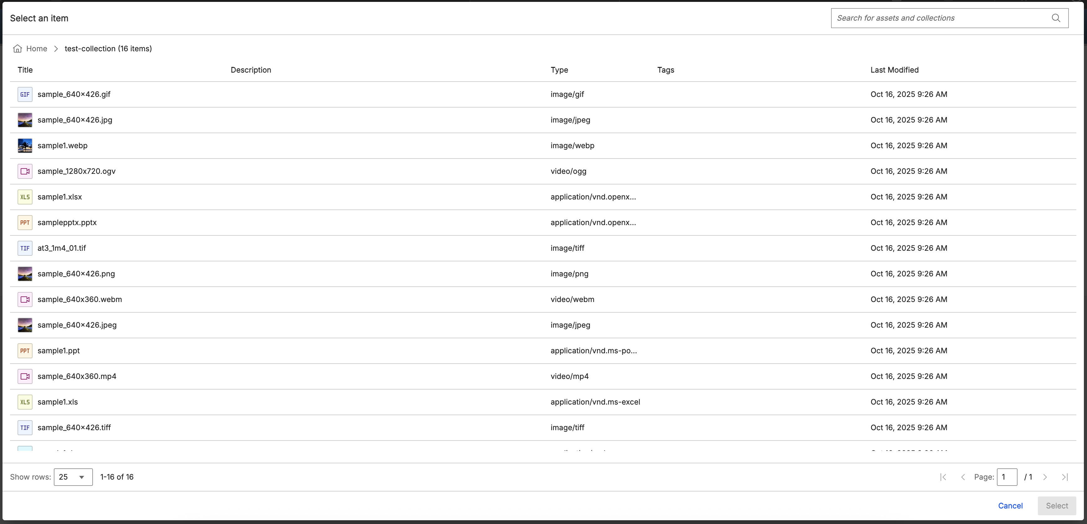 When you open DX Picker with a different content source type, the list of objects from the content source is displayed.