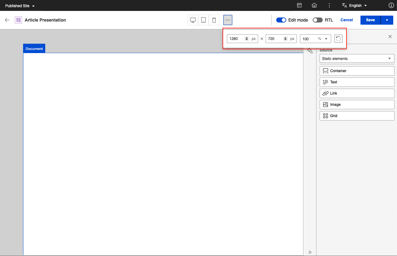 The canvas dimensions settings in Presentation Designer can be used to set the width and height of the canvas to adapt to specified size requirements. You can also use the dimensions settings to select from predefined sizes such as Desktop, Tablet, and Mobile.