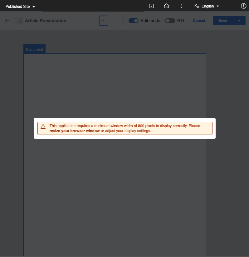 Message Display Below 800 Pixels: If the window width is reduced below 800 pixels, the following message is displayed: