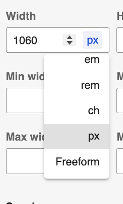 You can change the measuring unit of each style property depending on the supported units. Click the measuring unit next to a style property to reveal a list of units you can choose from. For example: