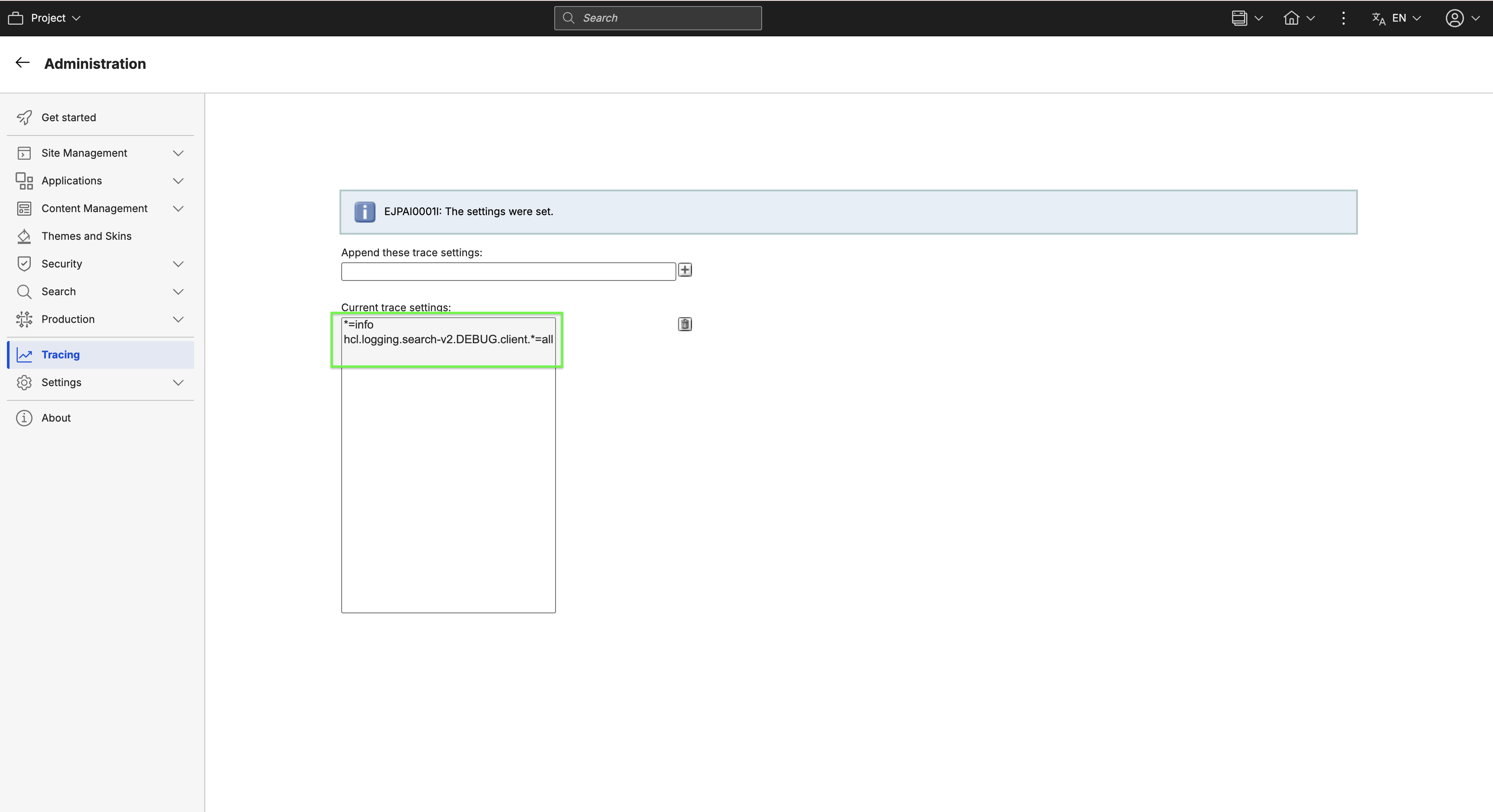 - Navigate to Administration > Tracing.