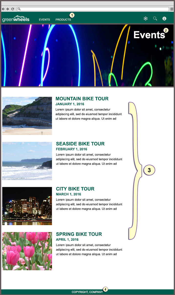 Le prototype HTML de page d'arrivée présente un grand nombre des éléments de conception qui sont inclus dans le prototype HTML de page d'accueil. Le prototype HTML de page d'arrivée contient le même en-tête et le même pied de page que la page d'accueil. Le composant de page de bannière est également utilisé sur les prototypes HTML de page d'arrivée et de page d'accueil. Toutefois, le prototype HTML de page d'arrivée contient un composant de page de liste dynamique qui présente plusieurs objets de contenu. Le prototype HTML de page d'accueil ne nécessite pas le composant de page de liste dynamique.