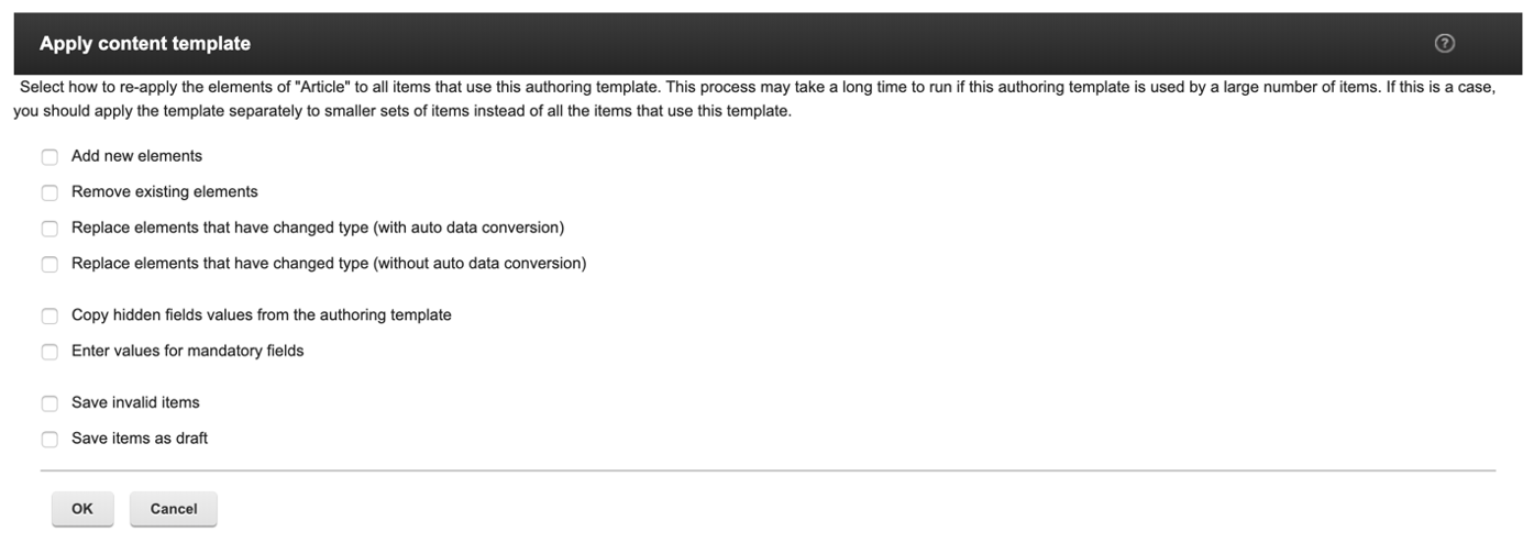 - Appliquez les modèles de contenu aux objets de contenu (pour les versions HCL Digital Experience 9.5 CF_173, CF18 et ultérieures. Cette option est uniquement disponible pour les utilisateurs des versions HCL Digital Experience 8.5 et 9.0 CF18.)