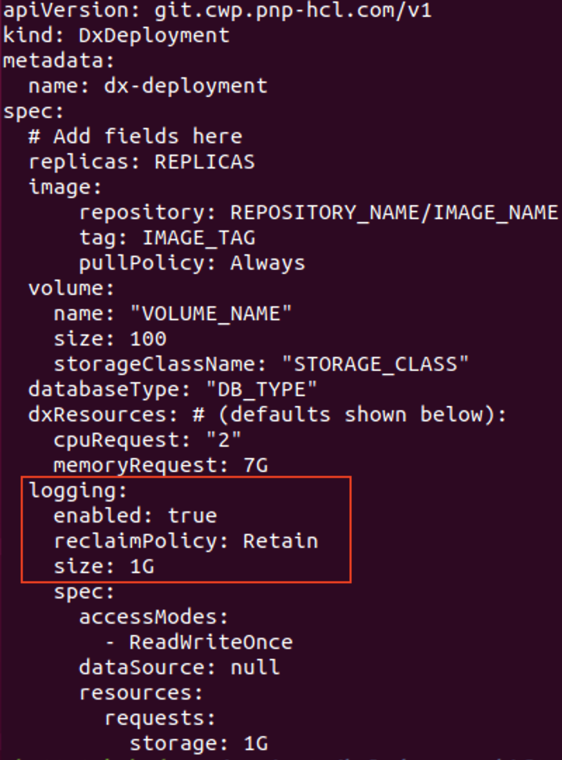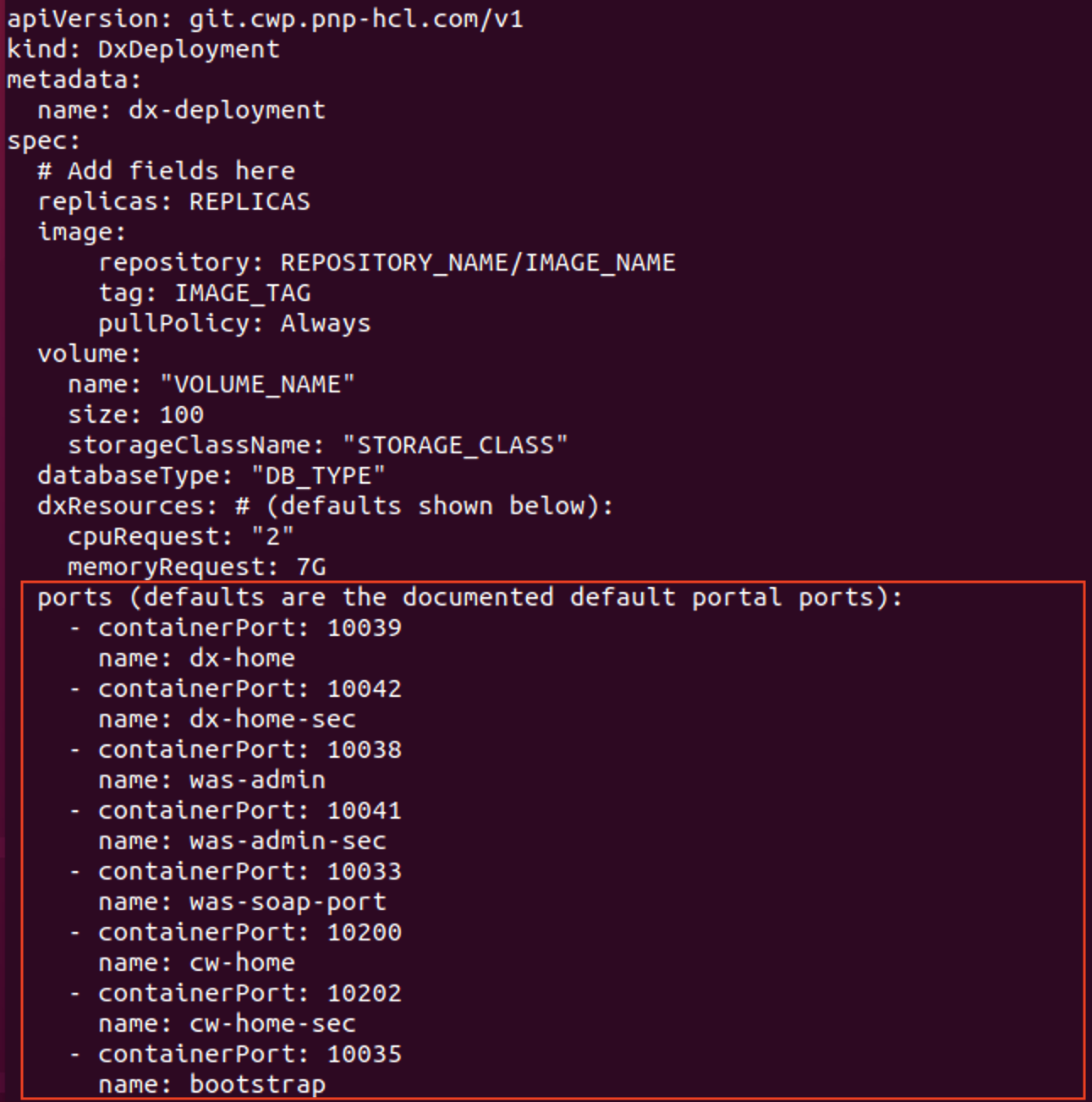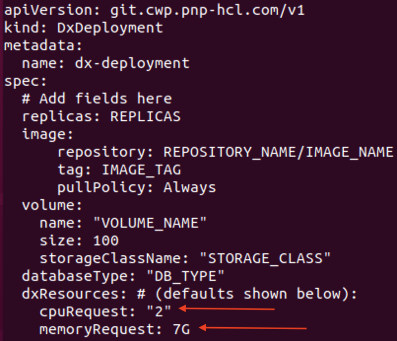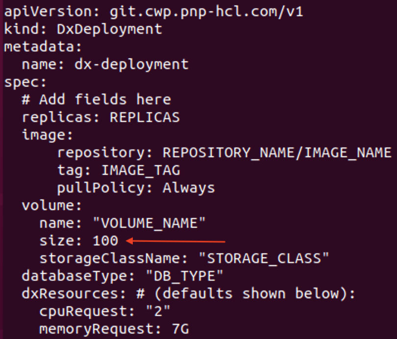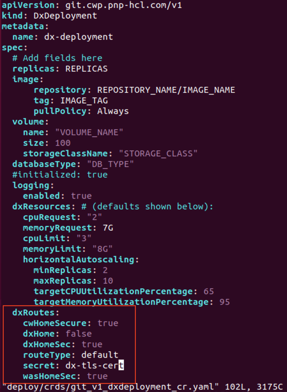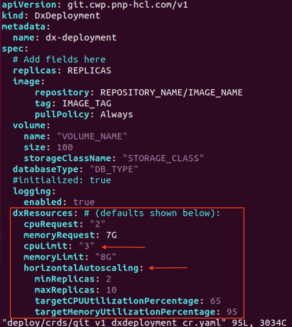 - Pour personnaliser la solution, les clients sont tenus de mettre à jour le fichier deploy/crds/git_v1_dxdeployment_cr.yaml situé dans hcl-dx-openshift-scripts_.zip qui se trouve dans le package hcl-dx-openshift téléchargé depuis la page HCL Software License Portal. Une fois modifiés, les scripts deployDx.sh et updateDx.sh doivent être exécutés pour effectuer (ou mettre à jour) le déploiement.Remarque : Toutes les modifications doivent être apportées à l'instance de ressource personnalisée et non aux parties individuelles du déploiement.