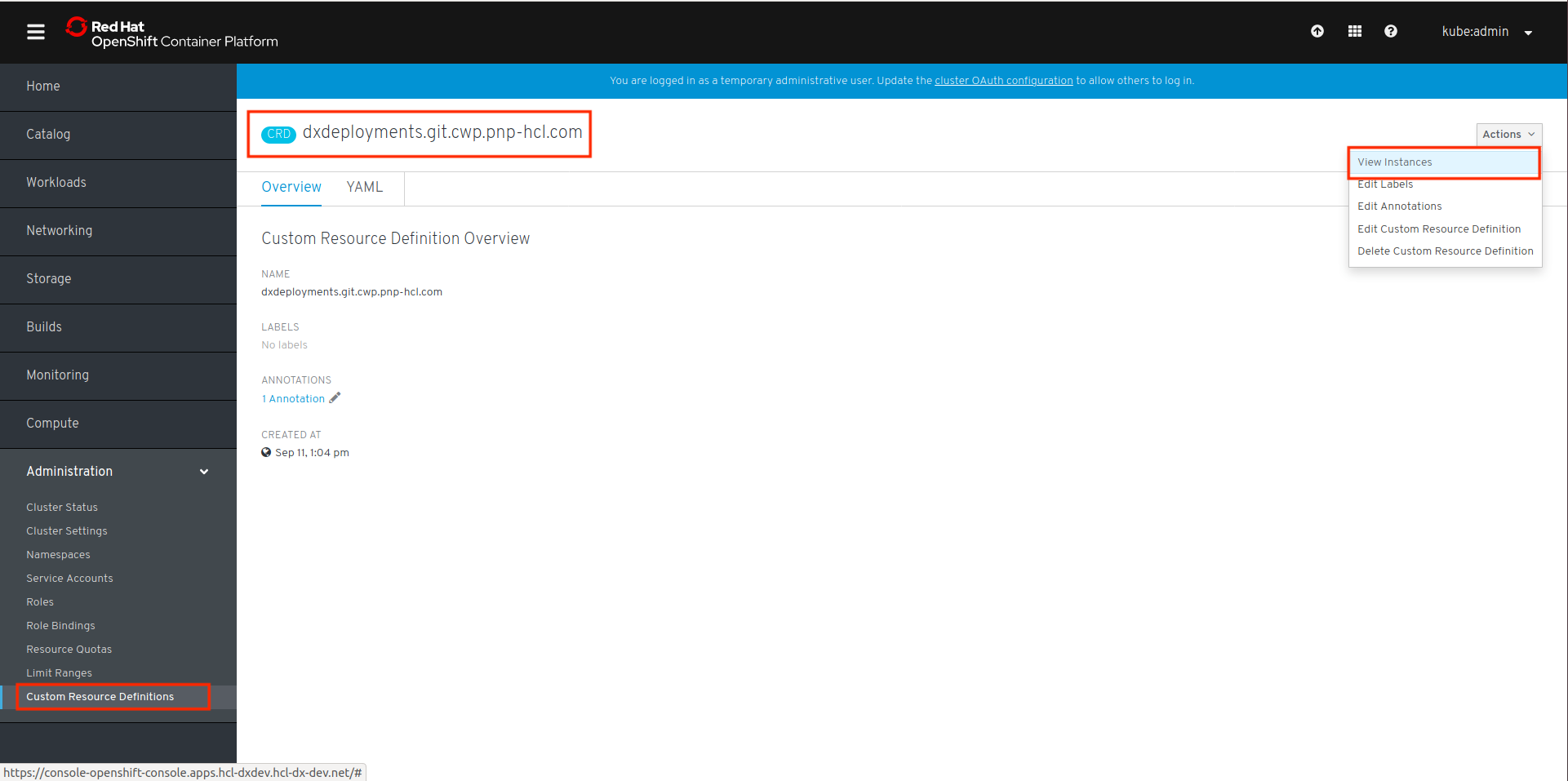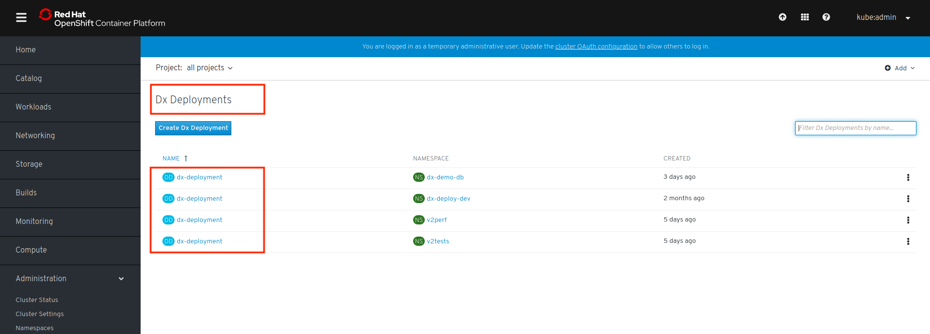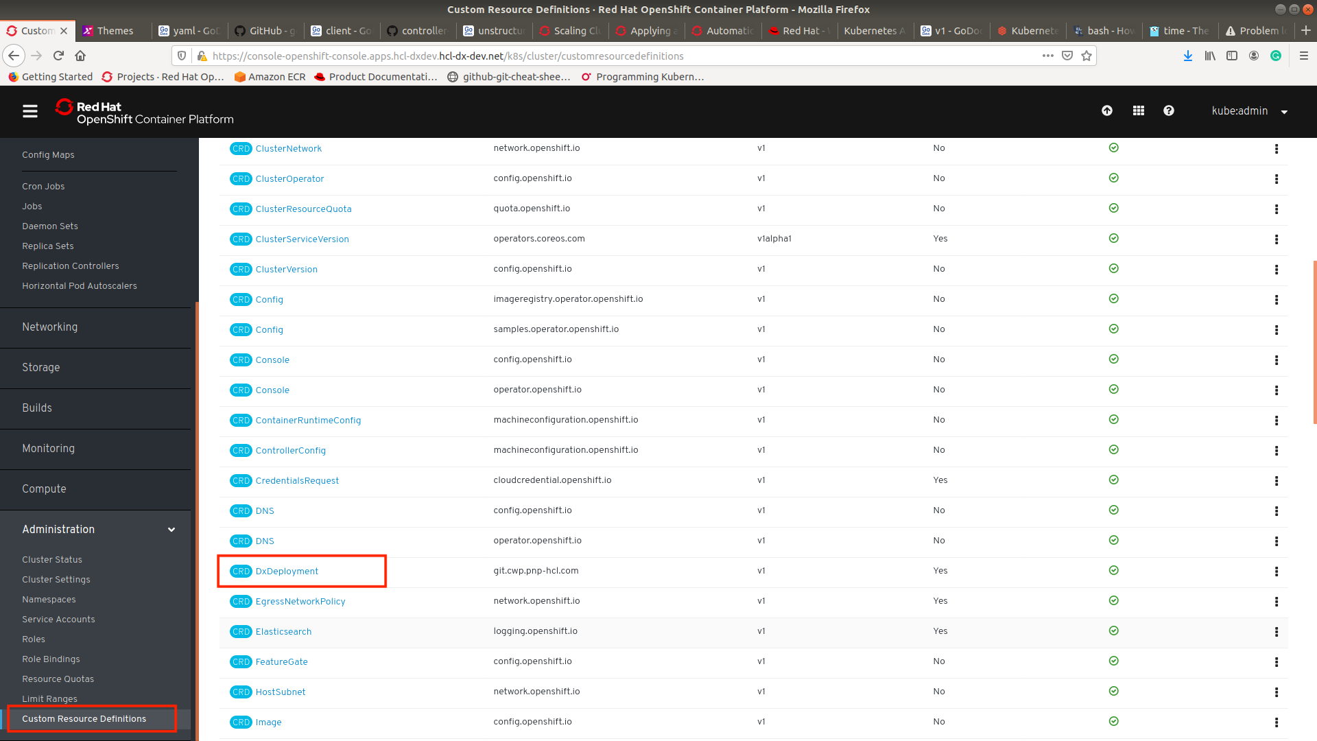 - Accédez à la console OpenShift, puis à Administrateur > Définitions de ressources personnalisées et faites défiler jusqu'à DxDeployments.