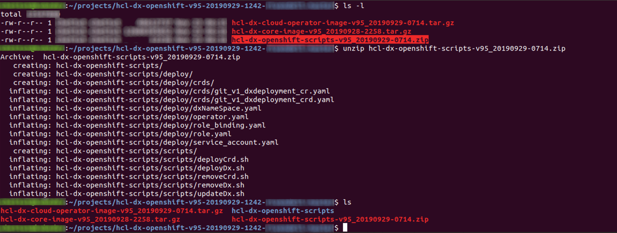 unzip hcl-dx-openshift-scripts-v95_xxxxxxxx-xxxx.zipFigure 2. Extraction des scripts OpenShift
