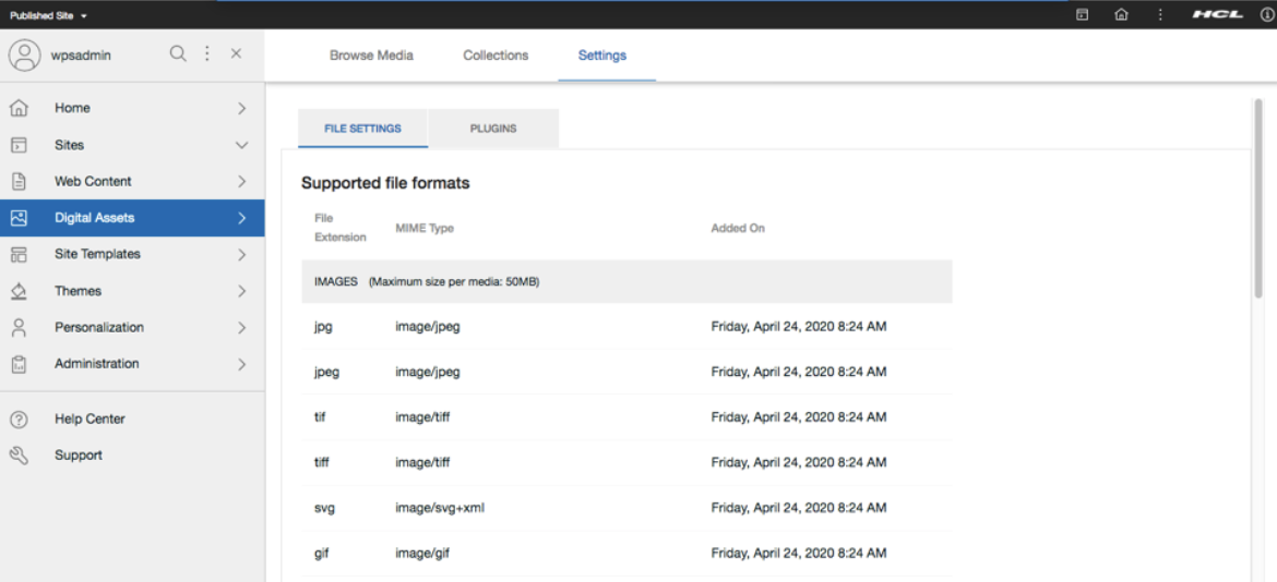 - Sélectionnez l'onglet Paramètres pour afficher les options Paramètres de la gestion d'actifs numériques présentées dans HCL Digital Experience 9.5 Digital Asset Management - Tech Preview.