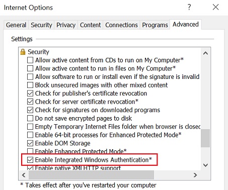 - Internet Explorer에서 로그인할 수 없으면 다음과 같이 브라우저에서 Windows 통합 인증을 사용으로 설정했는지 확인합니다.