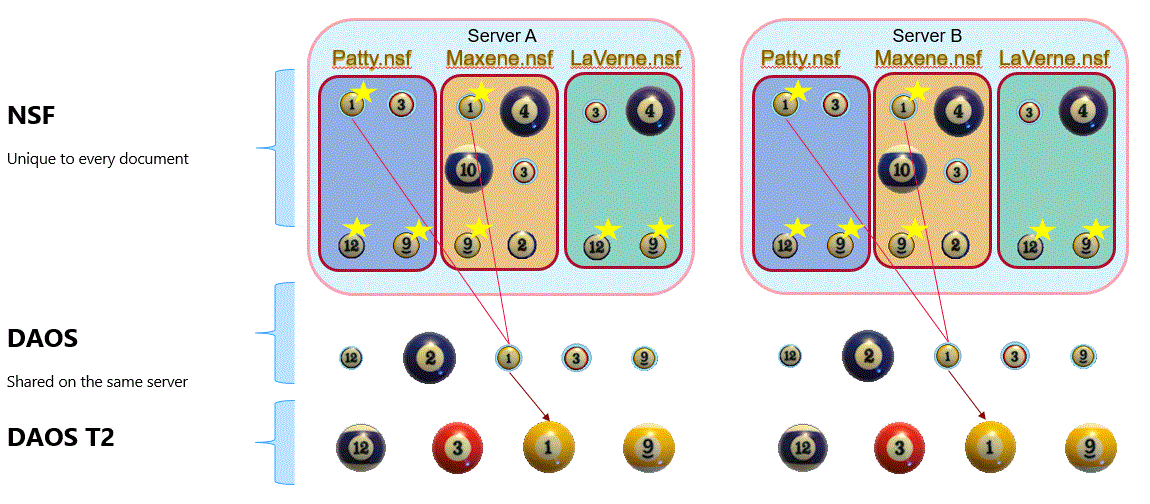 因為 DAOS 物件會根據上次在每部伺服器上存取它們的時間,跨伺服器獨立「變老」,所以某個附件檔物件可能在某些伺服器上的第 1 層中,以及在其他伺服器上的第 2 層中。