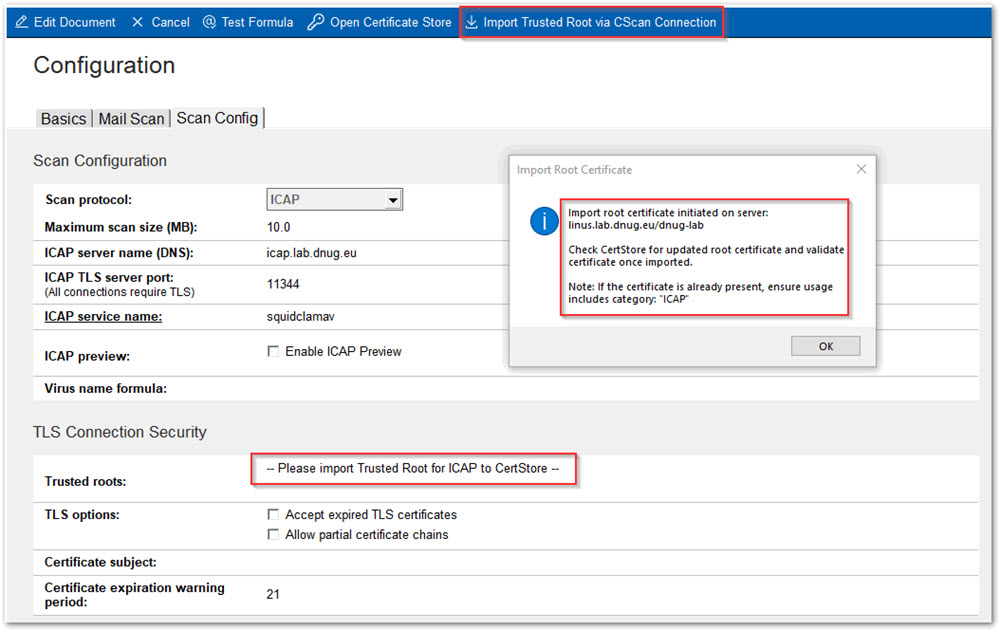 [CScan 接続経由の信頼されたルートのインポート] アクションをクリックして、サーバーでインポートプロセスを呼び出します。以下に示すようなダイアログが表示されます。「OK」をクリックします。cscancfg.nsf を開いたサーバーは、構成済みの ICAP サーバーへの TLS 接続を開始し、そのルート証明書を同じサーバー上の certstore.nsf にインポートします。