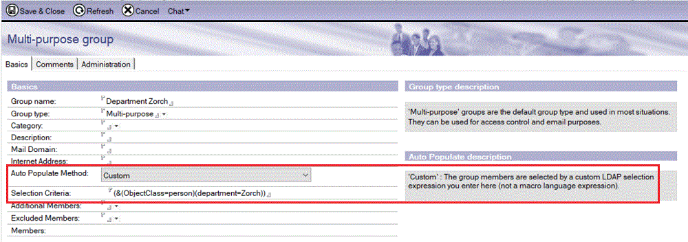 グループを作成する場合、[自動取り込み方法] フィールドで [カスタム] を選択し、[条件式] フィールドに Domino ディレクトリーを検索するための LDAP 検索クエリを入力します。次の例では、部門「Zorch」が割り当てられている Domino ディレクトリーでユーザー文書を検索します。