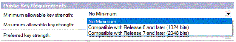 例えば、サーバー文書の [管理] タブにある [パブリックキーの要求] セクションには、[すべてのリリースで互換 (512)] オプションと [すべてのリリースで互換 (630 ビット) ] オプションが含まれなくなりました。