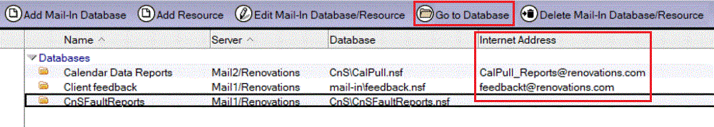 邮件接收数据库和资源视图现在会显示拥有这些数据库的邮件接收数据库的因特网地址。此外,该视图还包含转至数据库按钮,以从视图中打开邮件接收数据库。