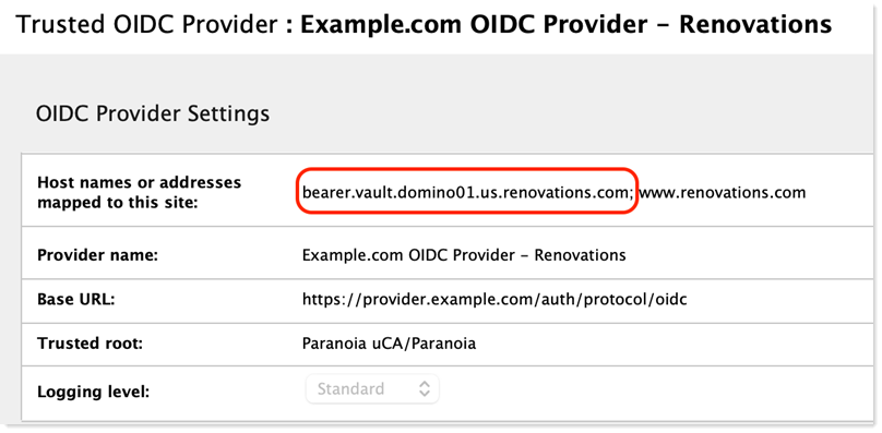 4. Populate the Bearer token (JWT) approved OIDC provider configurations field with the DNS host name of the ID vault server preceded with the string "bearer.vault.". For example, for an ID vault server with a host name of "domino1.us.renovations.com" enter a value of "bearer.vault.domino1.us.renovations.com".