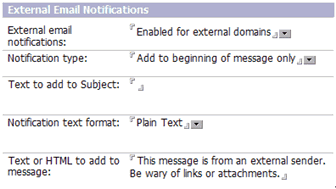 External email notifications allow you to set custom text to add before the Subject line or message body of emails coming from outside your environment. Unlike message disclaimers (sender-based policies) and recipient-based policies, this feature allows a single text or HTML configuration for all external mail.