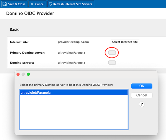 - If you want to change the set of Domino servers that will host the OIDC provider, click the button beside the Domino servers field and select the desired servers.