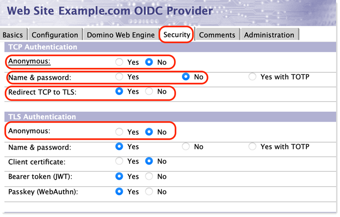 - On the Security tab, in the TCP Authentication section, set Redirect TCP to TLS to Yes and the other circled fields to No.