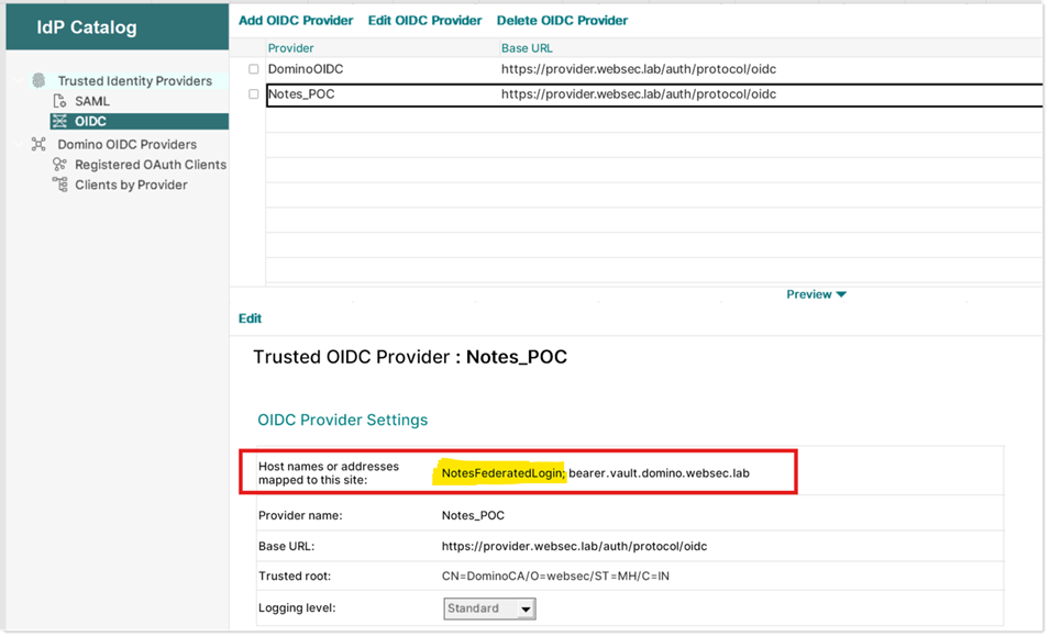 Note: This Trusted OIDC Provider document can be the same one that was created here: Configuring the ID vault for federated login with OIDC - you can simply add "NotesFederatedLogin" to the host name of the existing document.