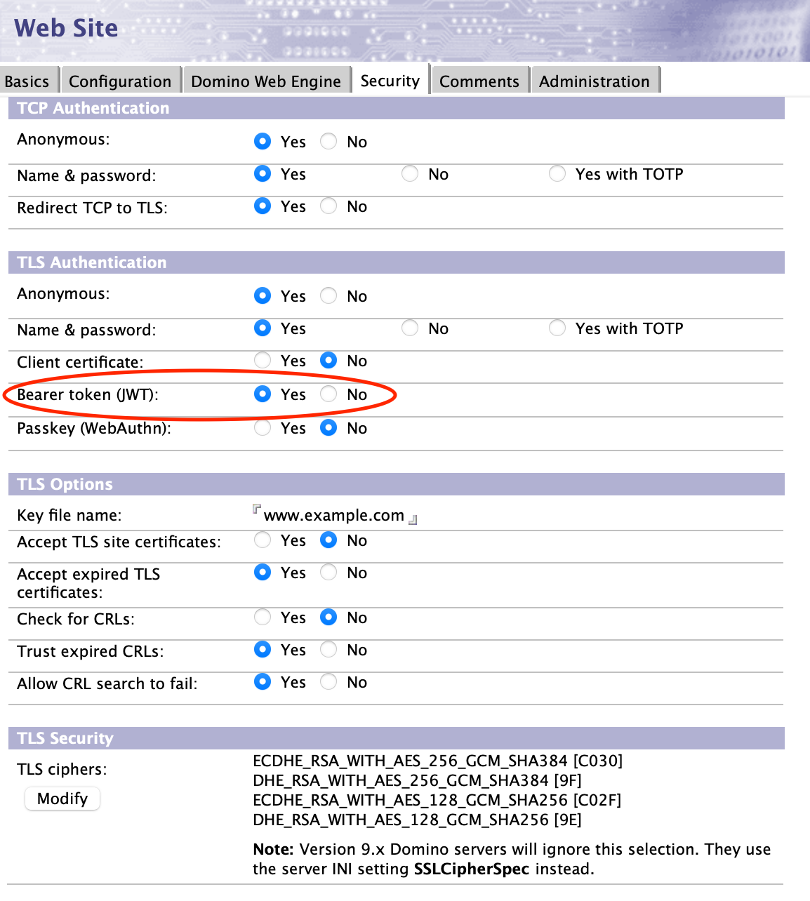 Enable authentication using Bearer tokens in the Server Document or the Internet Site Document in the same manner as Basic and TLS Client Certificate authentication.