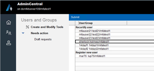 From the Users and Groups page, click Draft requests to view the various requests that have been created as part of the background recertification maintenance thread or as part of CSV or Active Directory user registration.