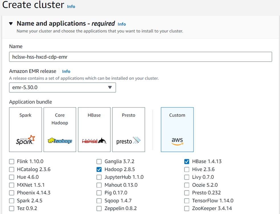 - From the Application bundles, select Hadoop and Hbase options.