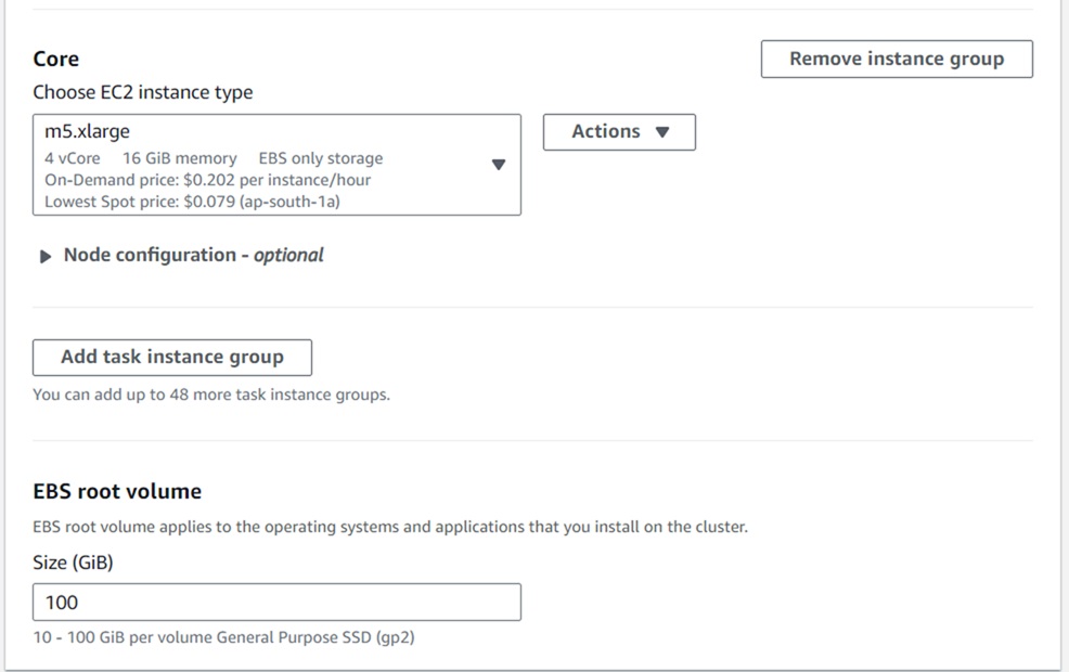 - Remove Task Instance Group, and update the EBS Volume size field to 100 GB.