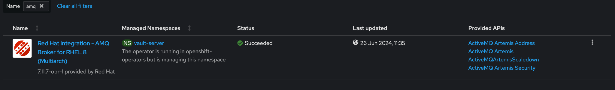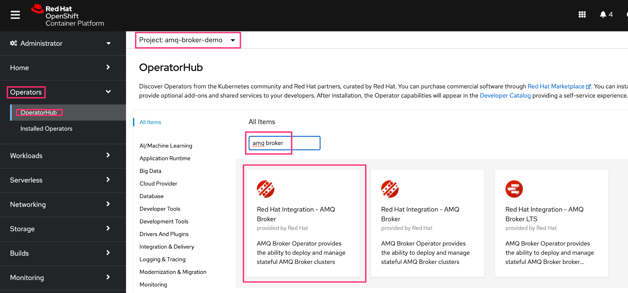 - In the OperatorHub, search for AMQ Broker, and in the Red Hat Integration - AMQ
