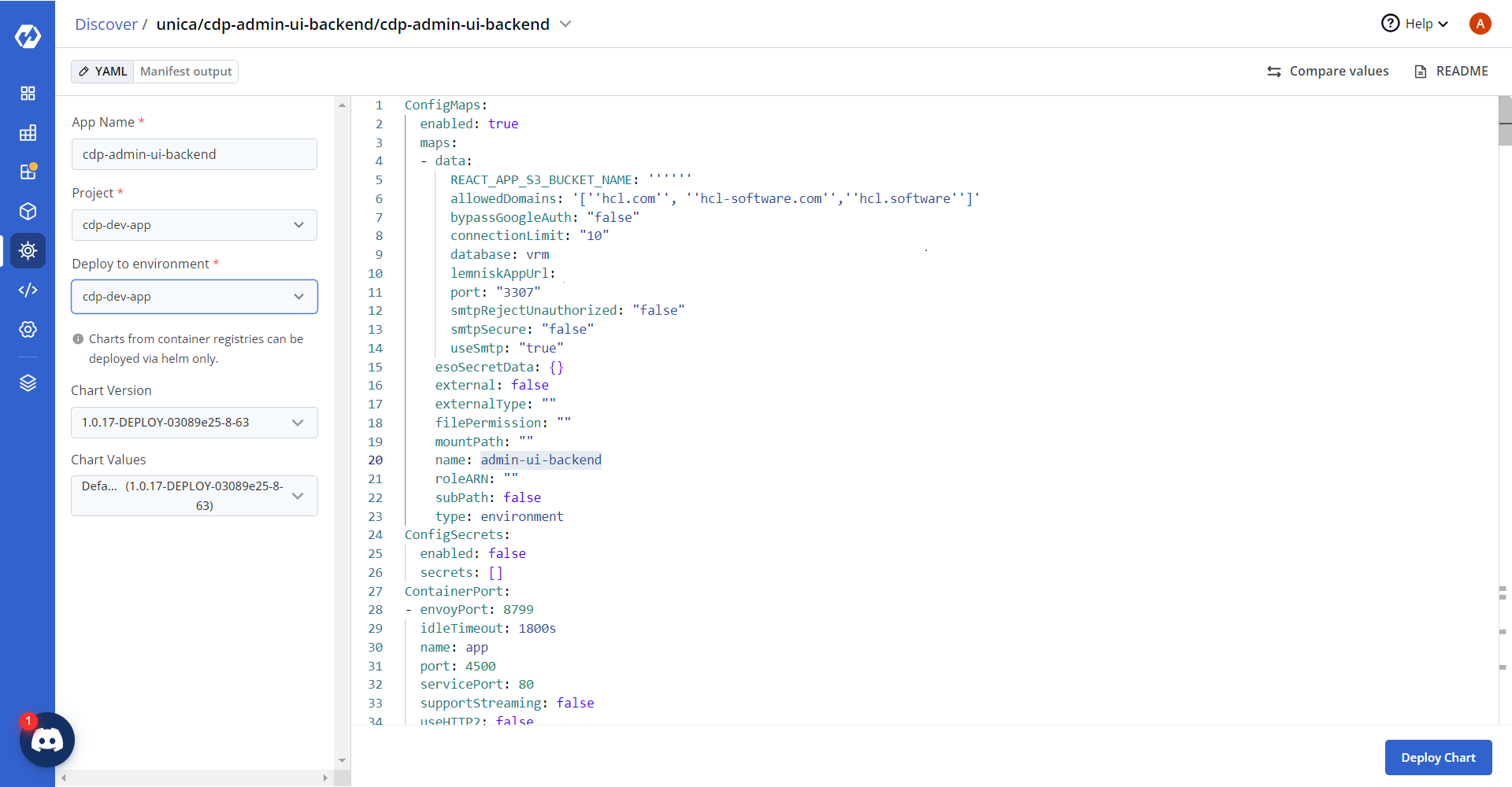 This section provides detailed instructions on how to deploy HCL CDP Admin UI Backend using the Devtron in the OpenShift.
