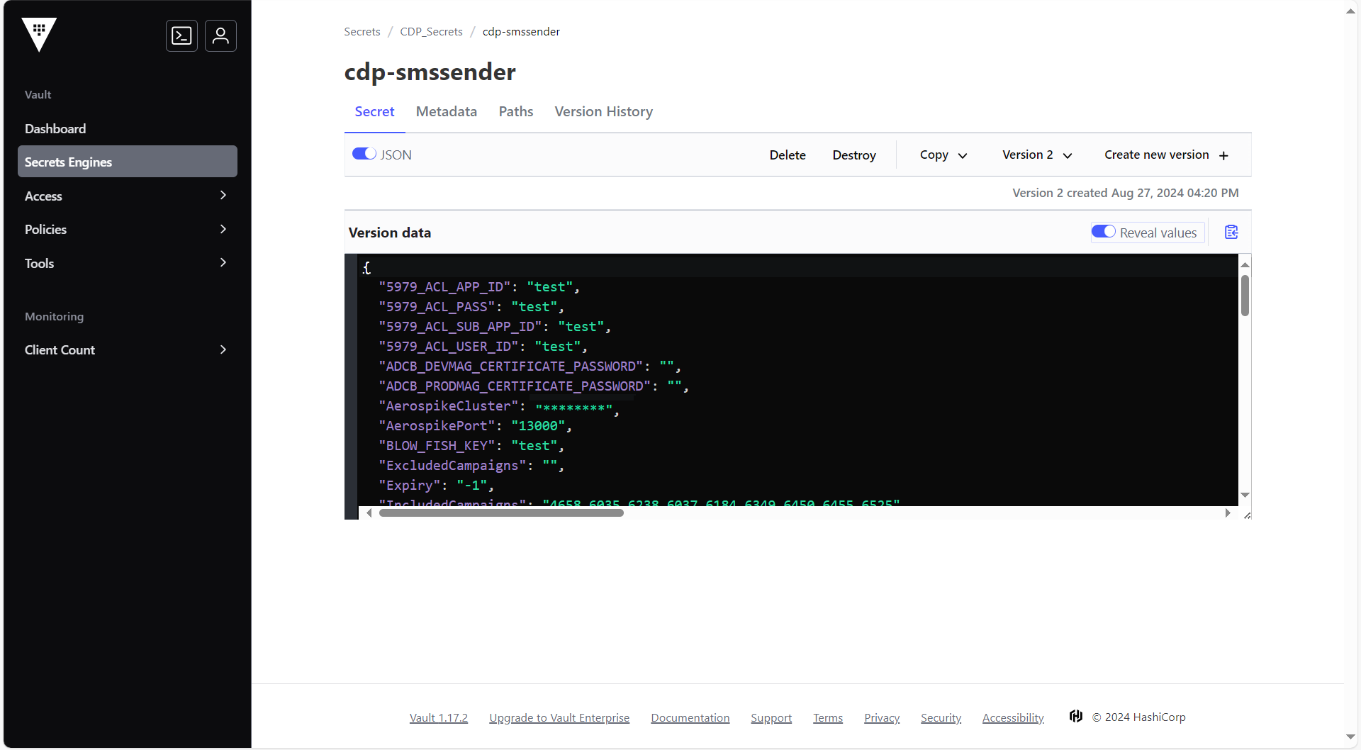 To create a CDP SMS Email Sender secret in the HashiCorp vault, follow the steps below: