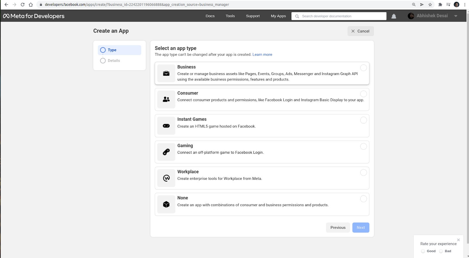 - Select Business as the App Type, and click Next.