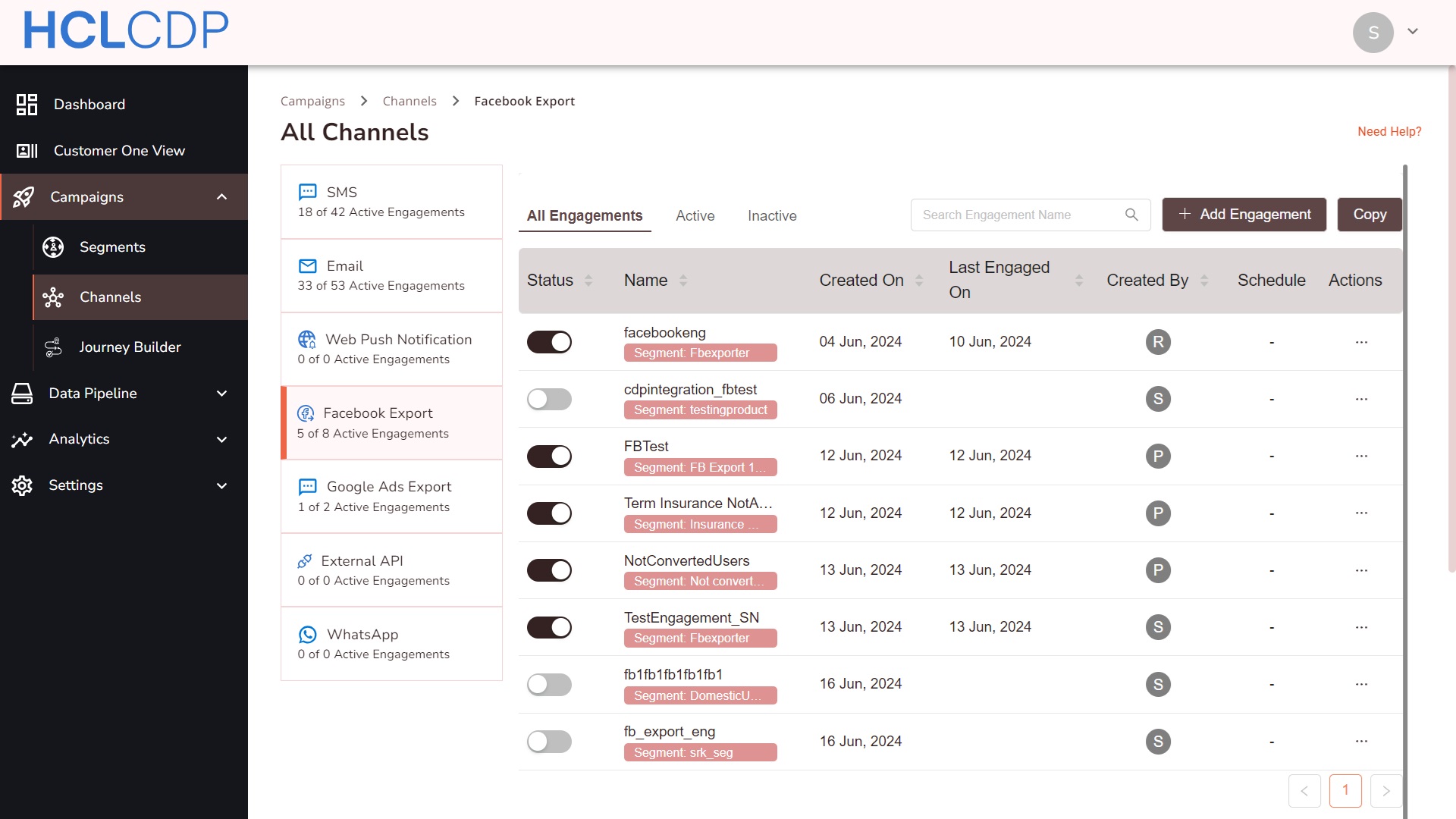 - In the Status column, you can activate or deactivate the engagement at any time using the toggle switch.