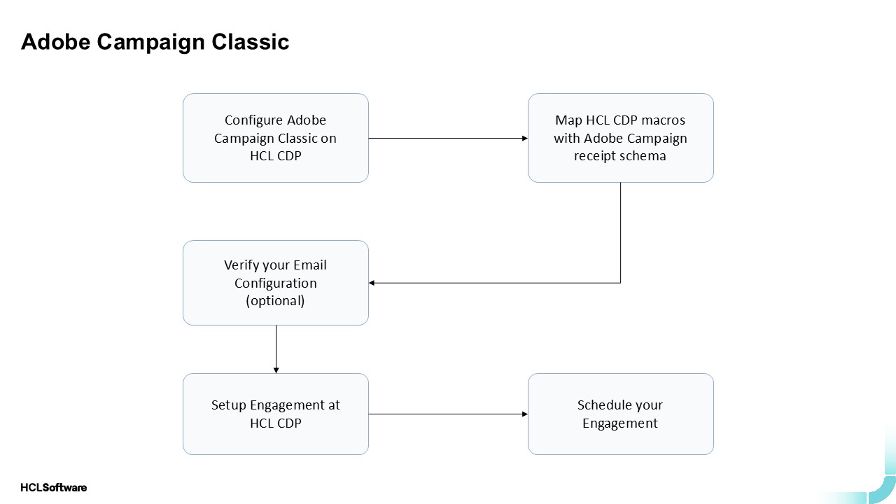 - Immediate trigger use cases are not supported since Adobe Campaign Classic receives data from HCL CDP before triggering emails. However, triggers based on specific times or events are supported.