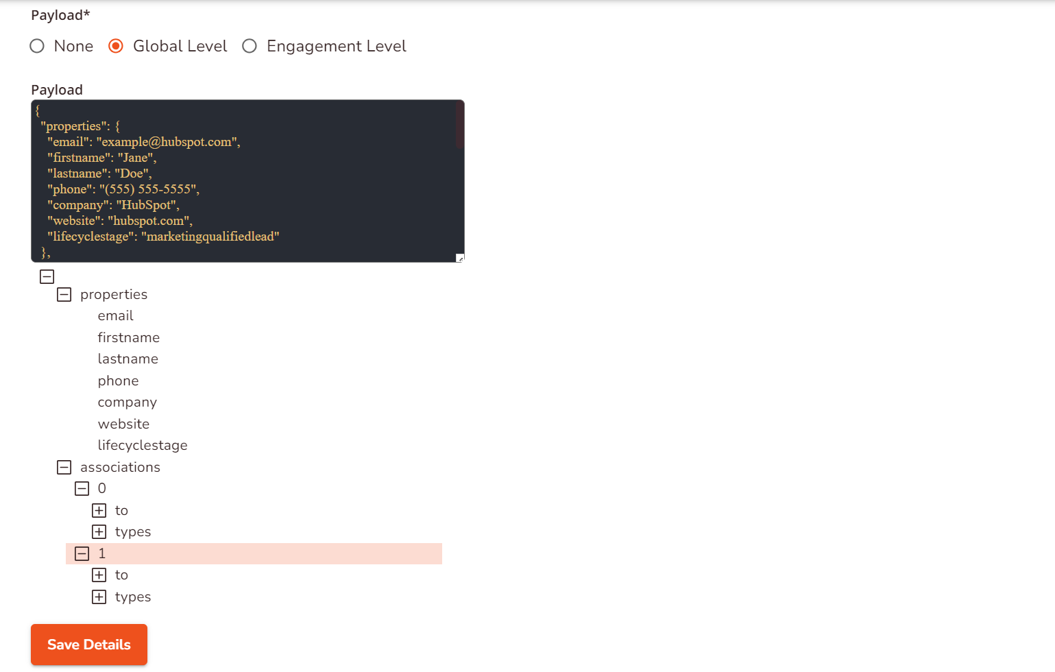 - Pass contact data to HubSpot by setting up the integration at the global level payload, as the payload values remain consistent across all engagements.
