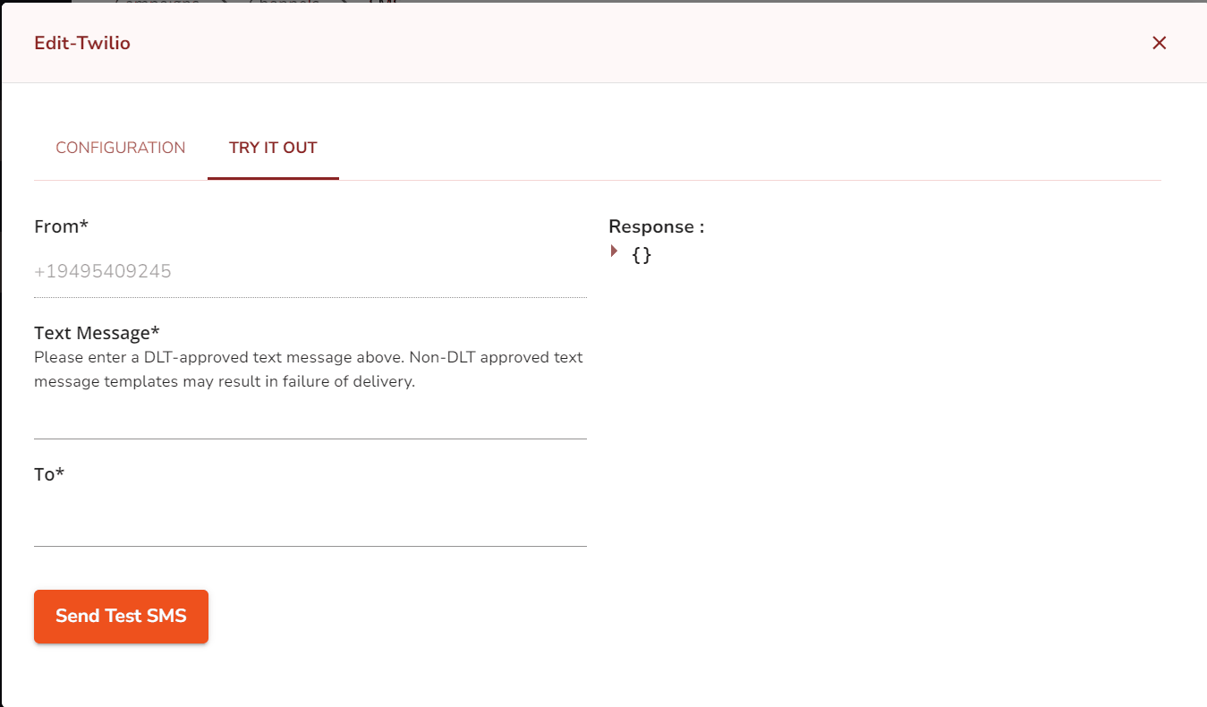 - Click the TRY IT OUT tab, in the Text Message, add a DLT approved text message template.