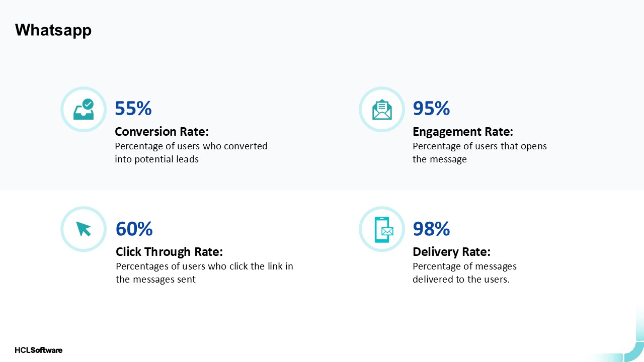 A variety of vendors now present solutions that enhance WhatsApp marketing, allowing businesses to customize messages and effectively target their desired audience. HCL CDP offers a comprehensive and effective WhatsApp service, aimed at refining your communication strategy and enhancing customer engagement.