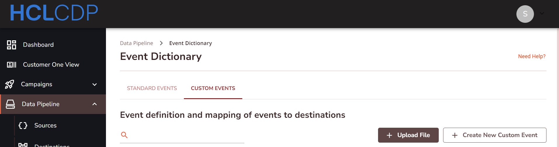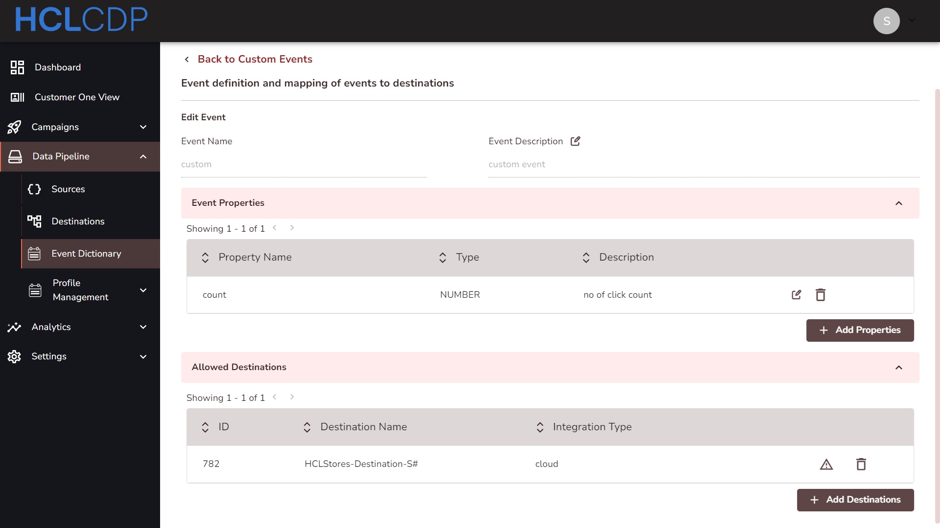 Standard events are pre-configured by HCL CDP, and include the following methods page, screen and identify.